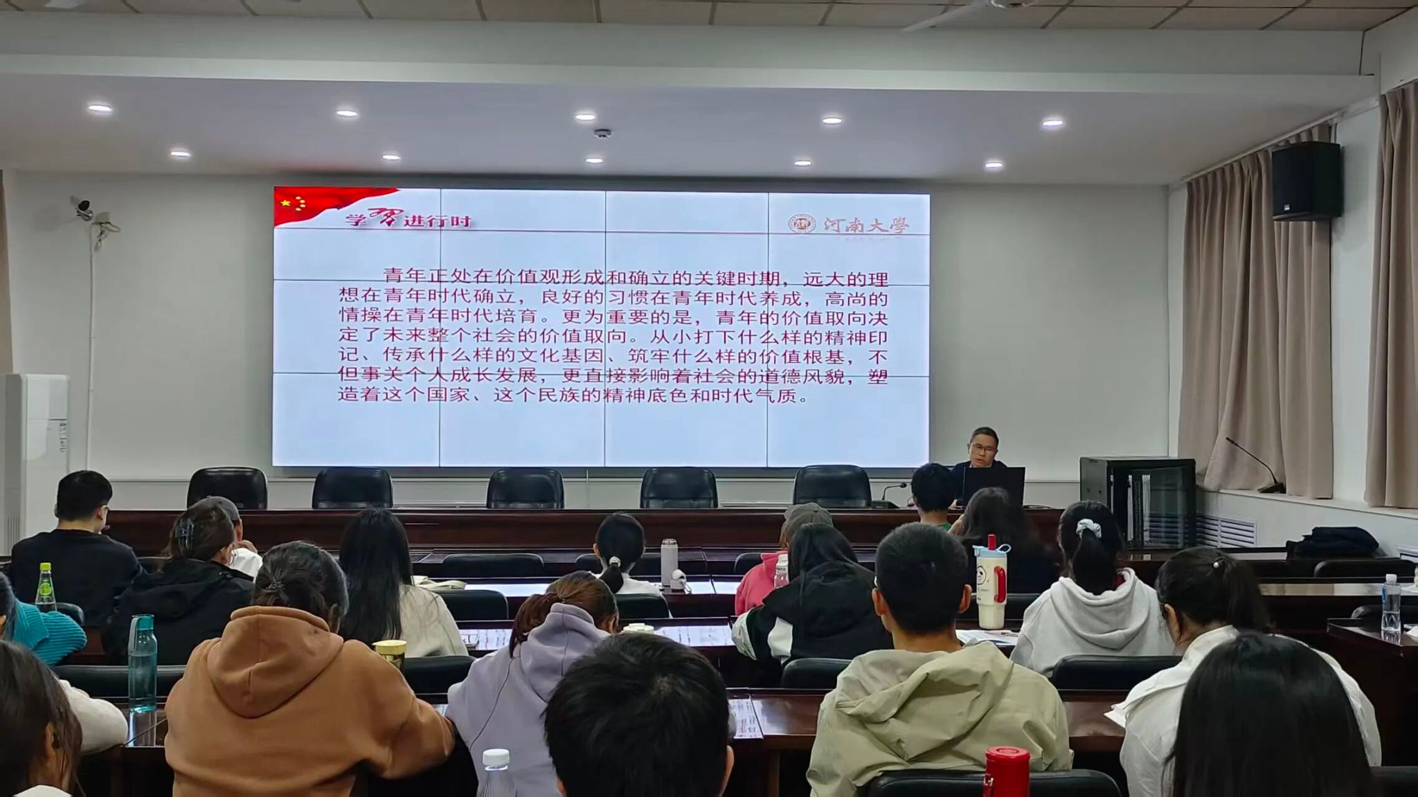 党课开篇,刘英钦直指青年价值观塑造的重要性,强调正确的价值观是青年成长的“定盘星”,不仅关乎个人发展,更影响集体风气与社会未来。他结合大学生活实际,特别提及宿舍氛围对个人成长的关键作用,指出“好的宿舍氛围能形成正向激励,实现‘全员上岸’的成长共赢”,用身边实例让同学们深刻理解集体环境与个人进步的紧密联系,引发强烈共鸣。