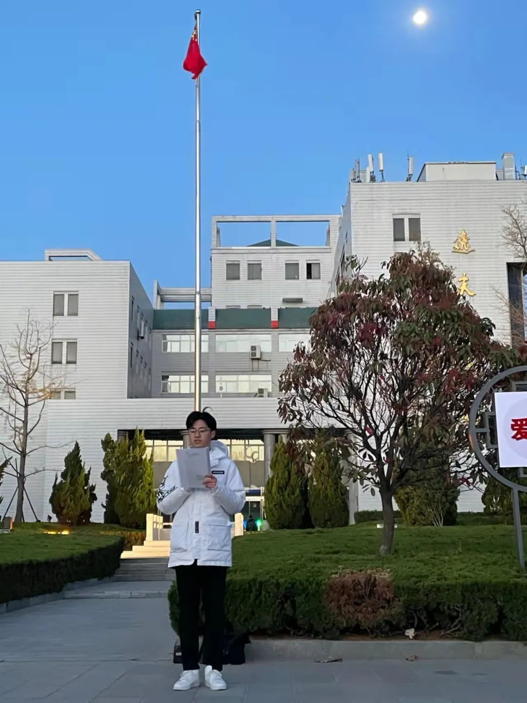 伴着雄壮的国歌,五星红旗冉冉升起,高高飘扬,同学们也得到了一场生动的爱国主义教育。在这边活动中,大家了解了党的光辉历程,学习到了党和国家对于青年人的殷切期望,激发了在场全体青年学子的拳拳报国心和爱国热情。青年学生,定将乘长风,破万里浪,描绘出百年大党的波澜壮阔。最后,在晨曦中,迎着朝阳,此次活动圆满落幕。