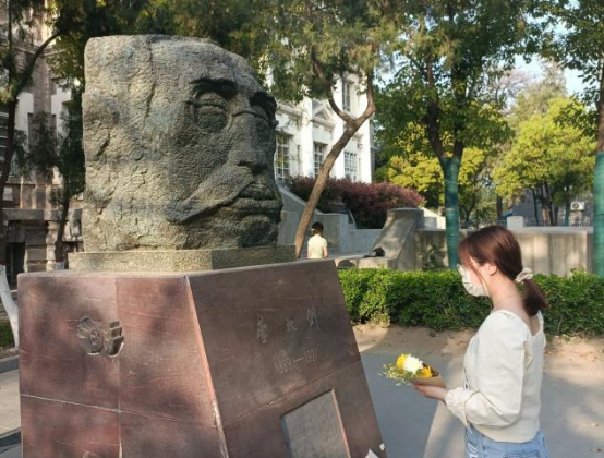 文化产业与旅游管理学院研究生团支部的杨湉湉同学选择在明伦校区六号楼门前李大钊先生的雕塑处,为其献一束花来表达对李大钊先生的敬重与怀念,以此献礼团的百年。