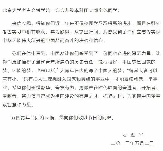 2012年6月,习近平总书记到北京大学调研高校党建工作时,看望了考古文博学院2009级学生,并勉励他们学好专业,为中华民族文化传承和祖国建设多作贡献。2013年五四青年节前夕,学生团支部全体同学习近平总书记以写信方式汇报了他们近一年来的学习、生活、思想情况特别是关于中国梦的认识和体会,同时表达了恳请总书记在百忙中再一次给他们送上寄语和嘱咐的期盼。习近平总书记予以回信,肯定他们立志为实现中华民族伟大复兴的中国梦而奋斗的理想和追求,勉励当代青年珍惜韶华、奋发有为,勇做走在时代前面的奋进者、开拓者、奉献者。