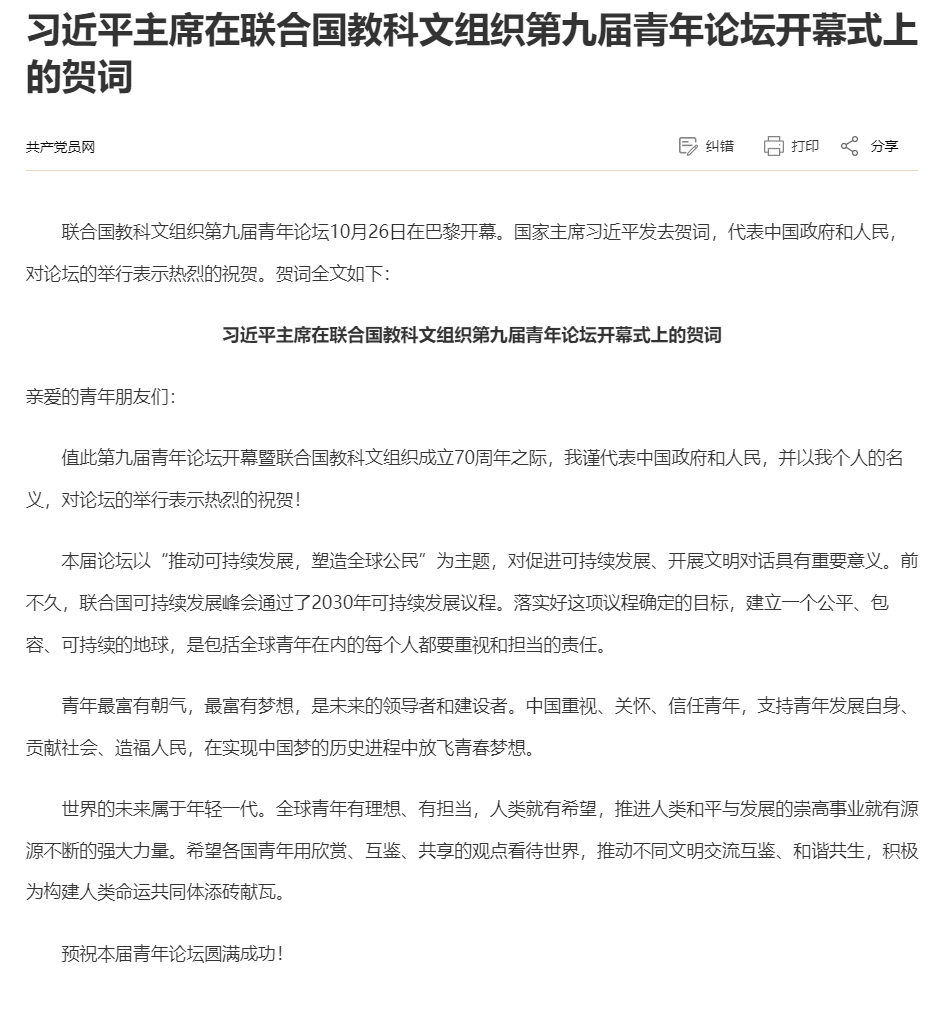2015年10月26日,第九届联合国教科文组织青年论坛在巴黎正式举行。该届论坛主题是“推动可持续发展,塑造全球公民”,来自教科文组织195个会员国的近千名青年代表汇聚一堂,就“截止到2015年可持续发展取得的成就”和“气候变化”两大核心议题展开热烈讨论。习近平总书记代表中国政府和人民对论坛的举行表示热烈祝贺。贺词强调:建设一个公平、包容、可持续的地球是全球青年共同的责任。青年是最富有朝气,最富有梦想,是未来的领导者和建设者。