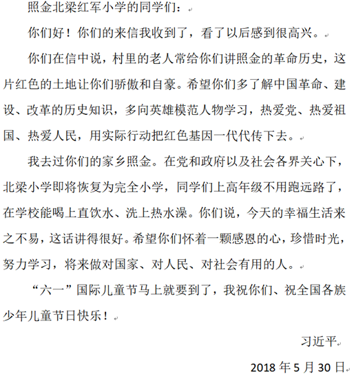2018年5月30日,习近平总书记给陕西照金北梁红军小学的学生回信,祝他们和全国各族少年儿童节日快乐。信中讲到: