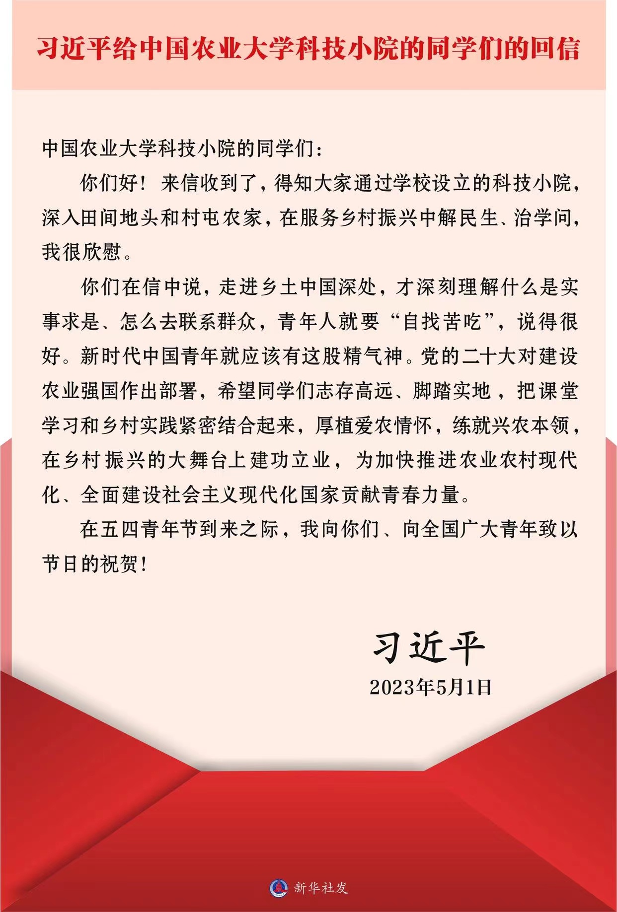 2023年5月3日,习近平总书记给中国农业大学科技小院的同学们回信,寄语广大青年要志存高远,脚踏实地,厚植爱农情怀,练就兴农本领,在乡村振兴的大舞台上建功立业。beat365组织全体团员青年以团小组的形式开展学习,回信在大家中间引起强烈反响。
