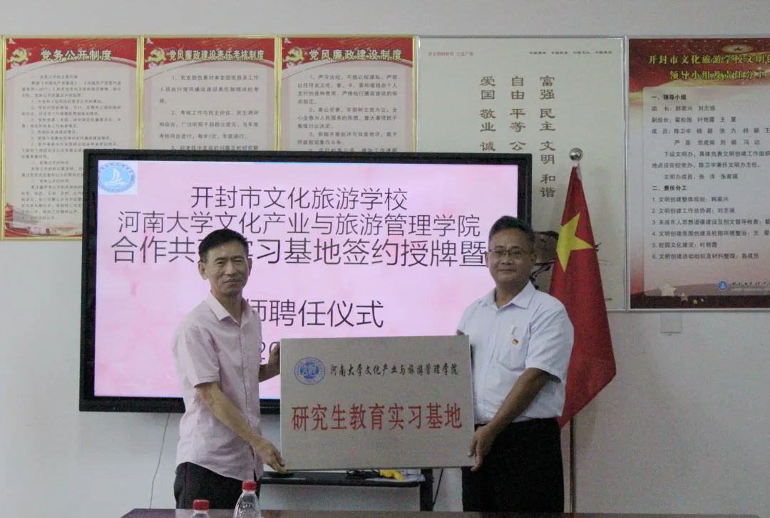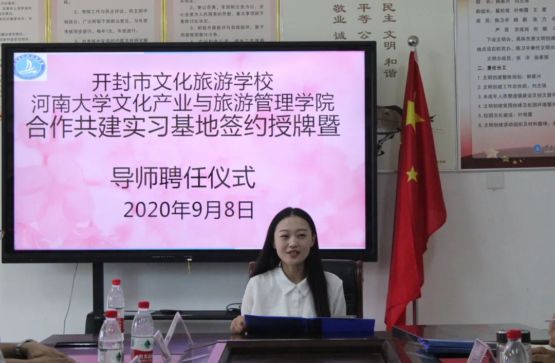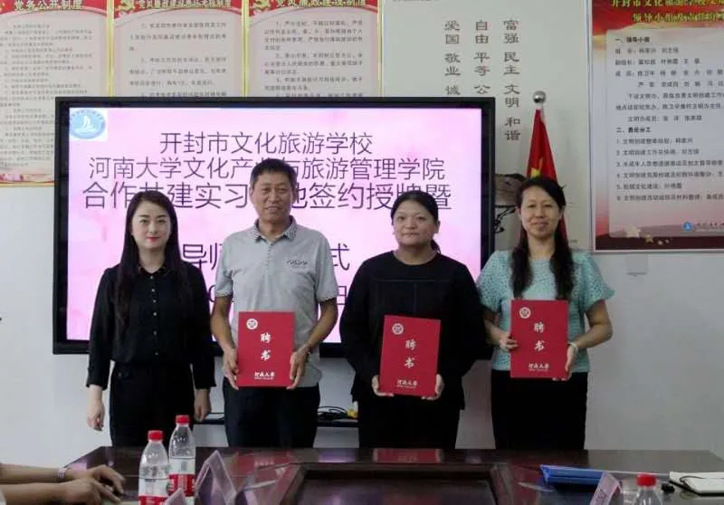 为进一步发挥高校人才培养优势,拓展校园合作机制。近日,beat365亚洲版官网文化产业与旅游管理学院与开封市文化旅游学校举行合作共建实习基地签约挂牌暨导师聘任仪式。开封市文化旅游学校校长刘志强、副校长叶艳霞、beat365亚洲版官网文化产业与旅游管理学院院长程遂营、党委副书记姜妍、副院长王东峰、教师教育学院副院长王晋及部分师生出席了此次活动。签约仪式由开封市文化旅游学校马运彩老师主持。