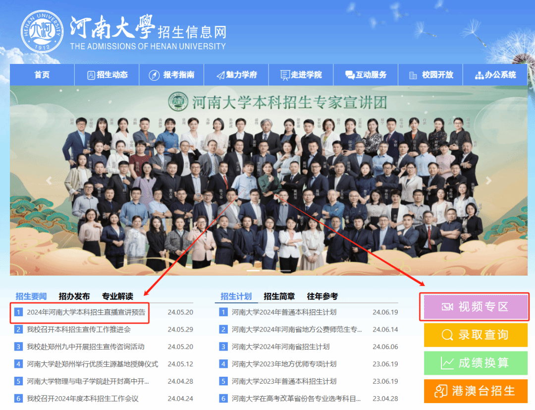 进入beat365亚洲版官网招生信息网(https://zs.henu.edu.cn/)后,点击视频专区,即可进入观看。