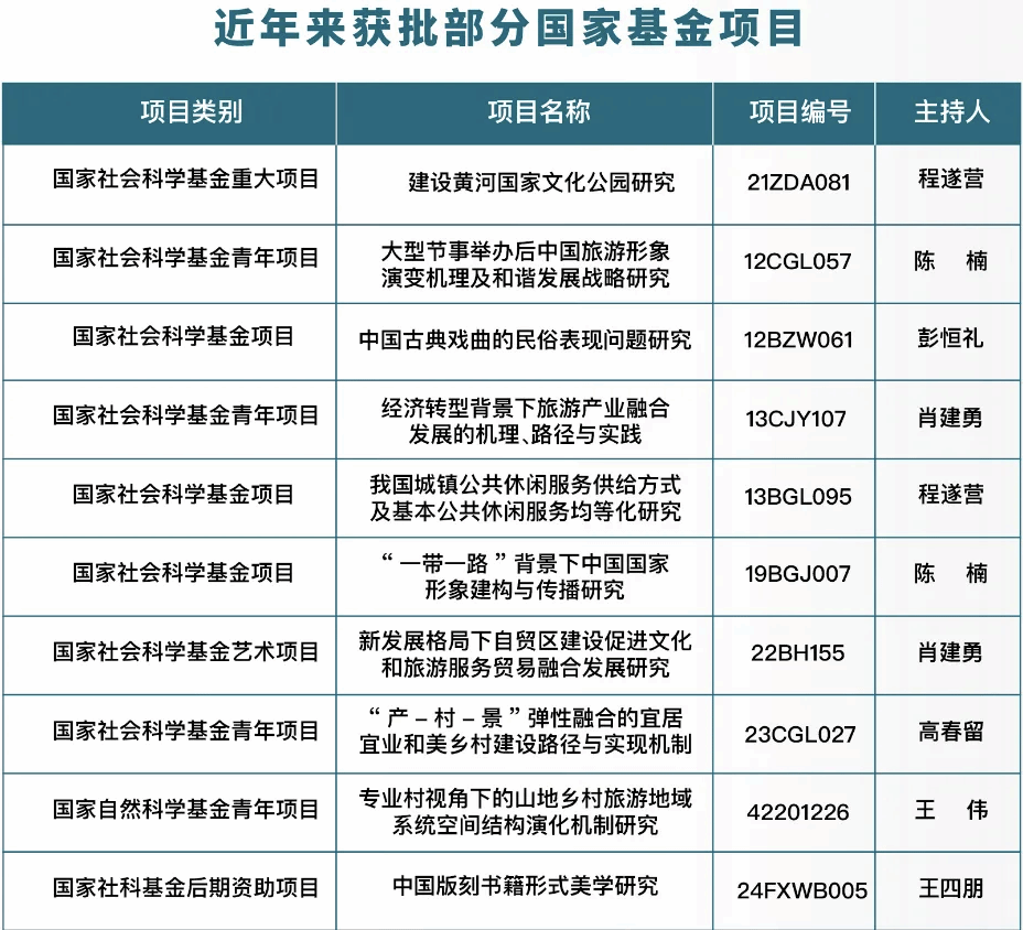 近年来,学院获批国家社会科学基金重大项目“建设黄河国家文化公园研究”等国家和省部级科研项目30余项,发表高水平学术论文100余篇,获得各类教科研奖励10余项。2015年以来,共出版《中国文化旅游发展报告》6辑,为文化旅游事业发展提供了具有前瞻性、战略性、创新性建议。