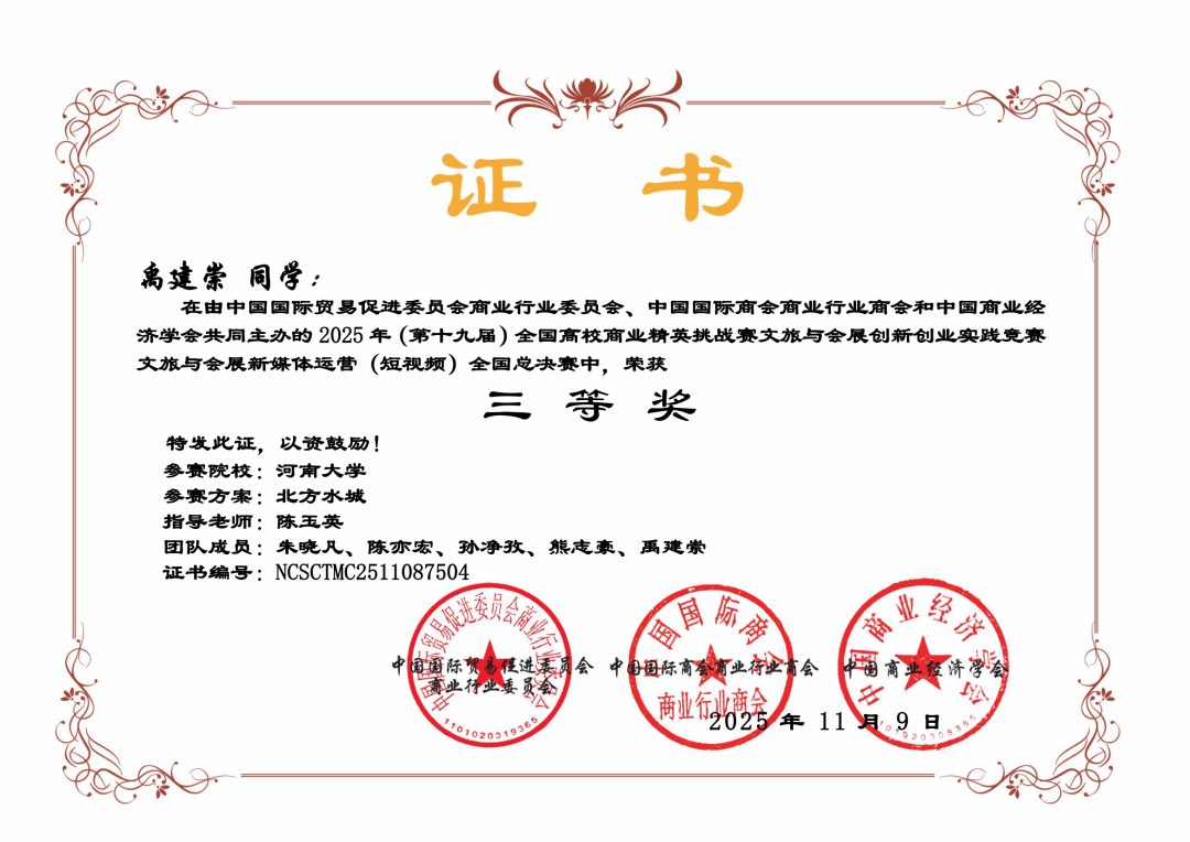 “第19届全国高校商业精英挑战赛文旅与会展创新创业实践竞赛”,由中国商业经济学会、中国国际商会商业行业商会、中国国际贸易促进委员会商业行业委员会主办,旨在为全国高校学子搭建文旅会展领域创新创业的交流与展示平台,鼓励青年学子以专业视角挖掘文旅价值、用创意赋能行业发展。该竞赛入选教育部认可的84项全国大学生学科竞赛名录(2025),在国内具有广泛影响力和公信力。第19届竞赛于2025年11月11日公布获奖名单。其中beat365学子朱晓凡、禹建崇组队参赛的作品《北方水城》荣获国家级三等奖。
