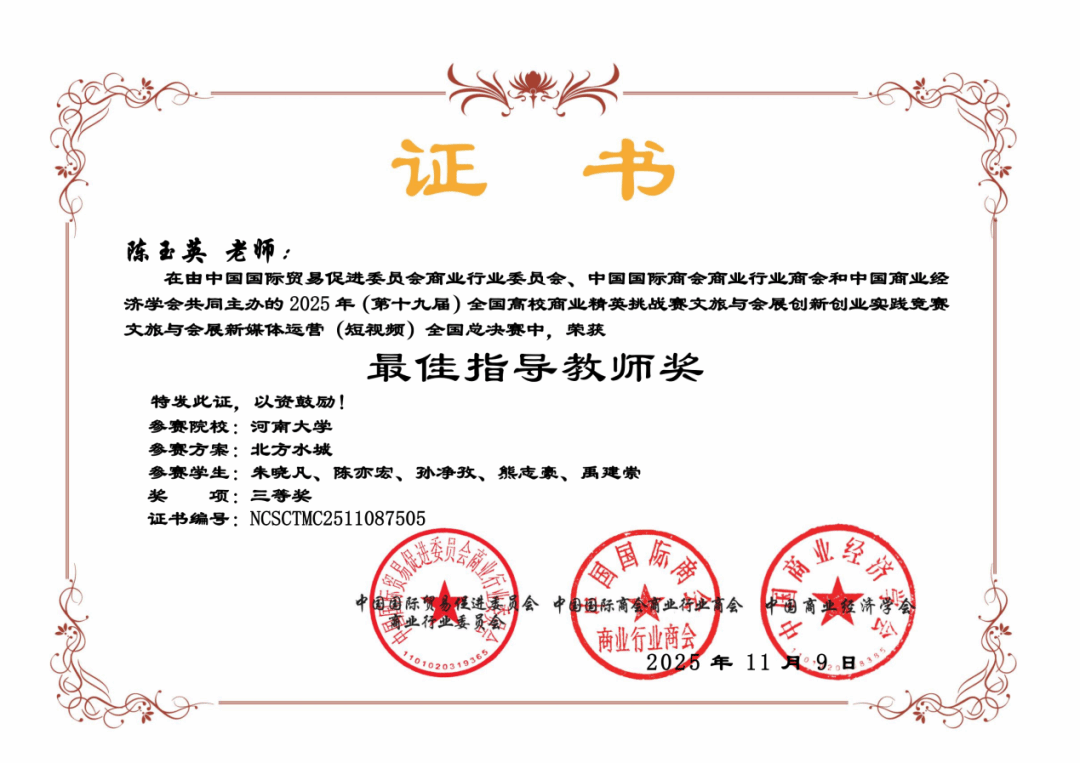 此次获奖,是beat365参赛团队长期深耕专业、不懈努力与付出的成果。beat365参赛选手代表朱晓凡表示:此次参与“第19届全国高校商业精英挑战赛文旅会展创新创业实践竞赛”的经历,让我们更深入地挖掘了中原城市的文旅底蕴,也提升了自身在文旅会展新媒体运营领域的实践能力。能够凭借作品展现开封“北方水城”的独特魅力,为学校争光,是我们莫大的荣幸!最后,我们想感谢beat365亚洲版官网指导老师陈玉英老师及领导们的悉心指导与大力支持,以及每一位给予我们鼓励的师长与同学!