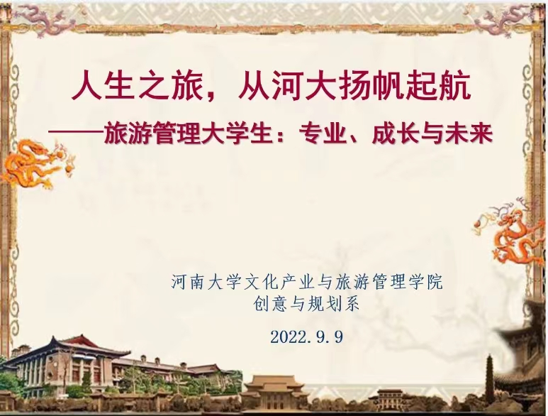 为提升2022级新生专业认知水平,增强大家对专业的认同感,构建师生沟通的桥梁,9月9日下午,beat365创意规划系的老师们为全体新生带来了一场题为《人生之旅,从河大扬帆起航》的精彩讲座。在讲座中,陈楠老师、宋军令老师、陈玉英老师以及袁箐老师分别为同学们讲述了他们对于旅游管理专业的认识。
