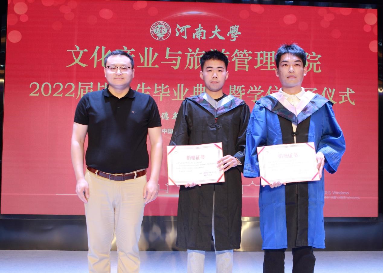 校友工作与教育发展基金会办公室副主任、教育发展基金会副秘书长唐胜为2022届毕业生代表颁发捐赠证书,并对学院毕业生积极参与学校“毕业季一元捐”活动给予了肯定。涓涓细流汇聚成海,希望未来能有更多同学参与到学校慈善公益活动当中,汇聚河大学子力量,共同助力母校发展。