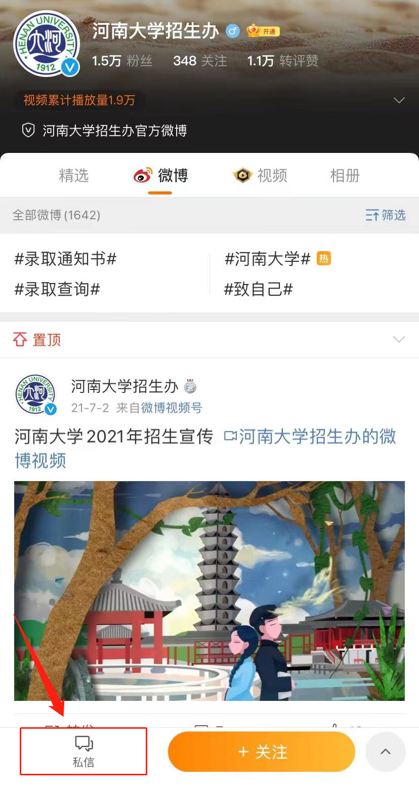 ◆ 进入新浪微博关注“beat365亚洲版官网招生办”,点击菜单栏中私信,进入聊天窗口。