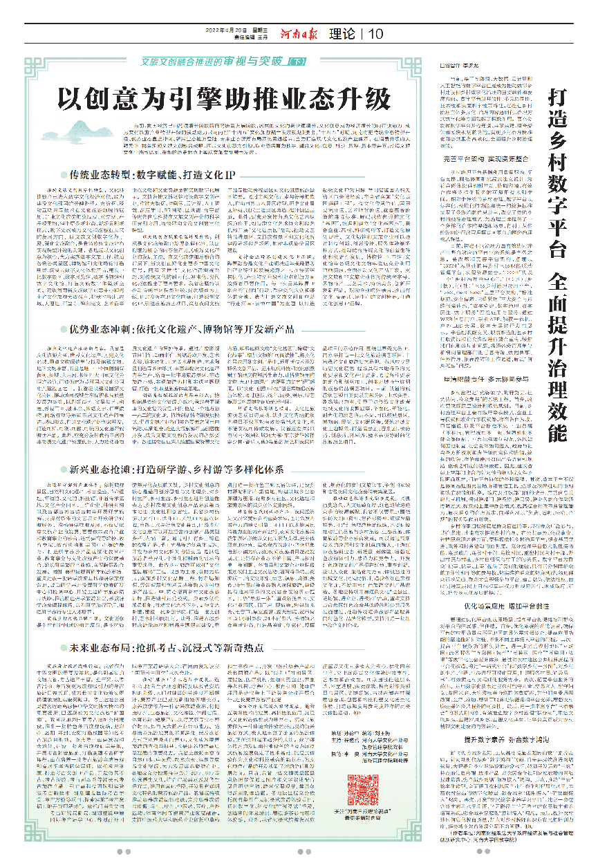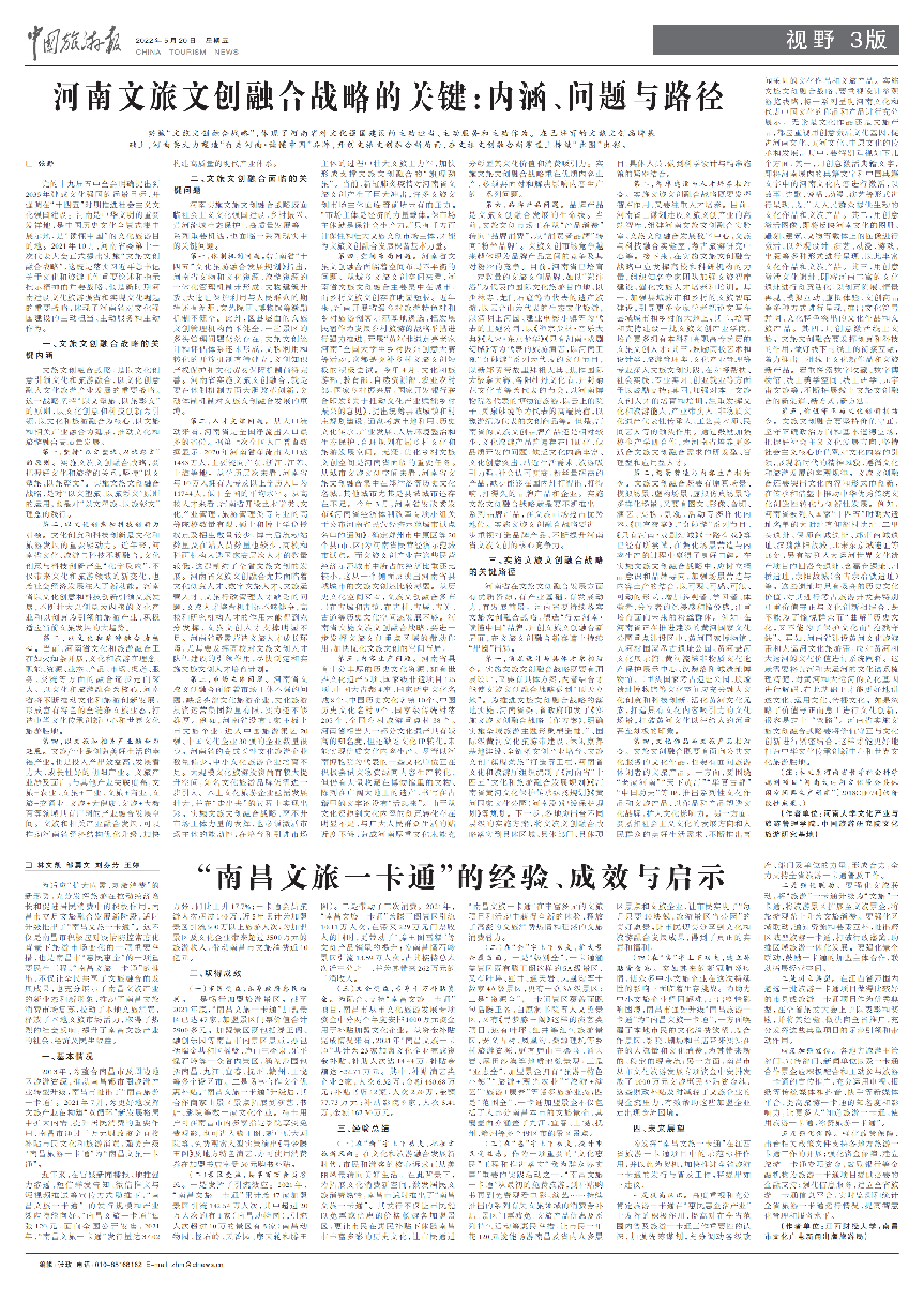 程遂营教授和李昊博士在《河南日报》发表题为《河南文旅文创融合推进的审视与突破:以创意为引擎助推业态升级》的文章。研究指出:河南应运用高新技术,驱动文旅数字化,以文化创意赋能景区转型升级,支持企业跨界创建文化IP品牌,促进传统业态转型;丰富文化遗产的表达,创造博物馆旅游新体验,丰富旅游演艺品牌,加速优势业态冲刺;打造研学游、乡村游、夜游、红色旅游等多样化体系,实现跨界融合发展,实现新兴业态抢滩;抢抓考古、沉浸式等新奇热点,为未来业态布局搭建桥梁。