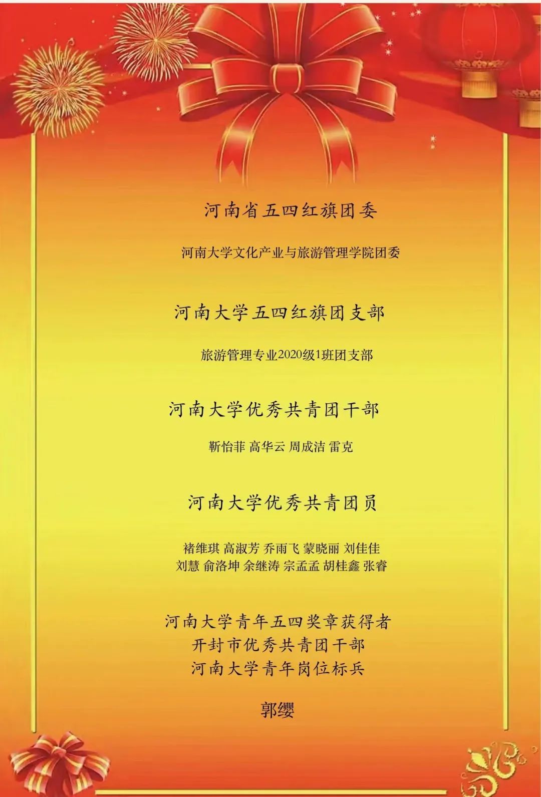 在本次表彰中,beat365团委获得“河南省五四红旗团委”称号,旅游管理专业2020级1班团支部获得“beat365亚洲版官网五四红旗团支部”称号,靳怡菲等4人被评为“beat365亚洲版官网优秀共青团干部”,褚维琪等11人被评为“beat365亚洲版官网优秀共青团员”,郭缨老师获得第六届“beat365亚洲版官网青年五四奖章”、“开封市优秀共青团干部”、“beat365亚洲版官网青年岗位标兵”。