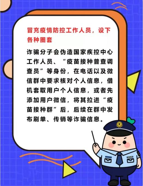 骗子冒充调查员实施诈骗。诈骗分子自称“防控中心某主任”,称受害人的健康码或检测报告有异常,可能是有人冒充受害人的个人信息登记打疫苗,要求前往公安机关核查,然后,主动将受害人的电话转接至“公安局”,以“清查资金消除嫌疑”为由实施诈骗。这是典型的冒充公检法诈骗“升级版”,骗子冒充疫情防控中心、卫健委致电受害人,再以各种名头给受害人扣上“涉嫌新冠疫苗违法犯罪”的帽子,其实这是骗子自导自演的戏码。