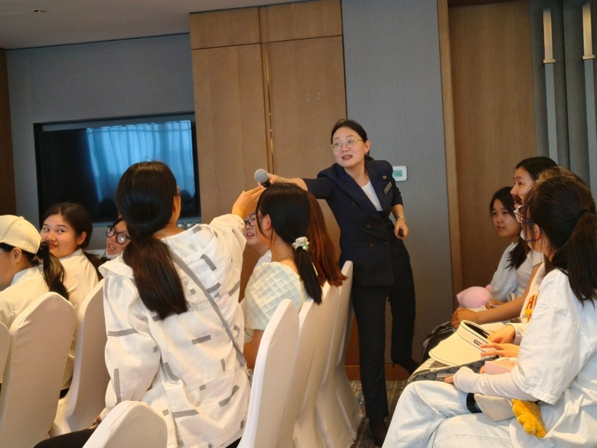 上午九点,同学们抵达喜来登酒店,开启专业考察的第一站。人力资源总监Tina为学生们讲述了万豪集团的相关信息以及公司发展状况,对喜来登这一品牌酒店进行了详细的介绍,总监通过结合自己身边案例,讲述了万豪集团的历史与酒店所秉持的价值观,并对大家表示期望,希望各位可以在未来发展中寻找自身价值所在。在讲解期间,总监多次与学生进行互动,大家积极回应,气氛活跃。