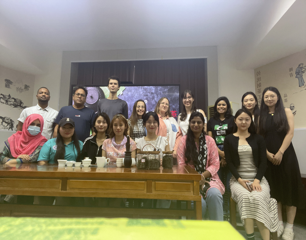 研究生刘婷首先为留学生们交流了中国茶文化的历史、品茶、冲泡以及茶具品鉴等茶知识,展示了奉茶、回礼等茶桌礼仪与冲茶技巧。随后,留学生们欣赏了研究生李金桓、张佩瑶展示的“一看、二闻、三品”的中国茶冲泡表演。在茶文化体验环节,伴随着优美的背景音乐,留学生们体验了中国茶的冲泡流程和技巧,一招一式颇有模样。