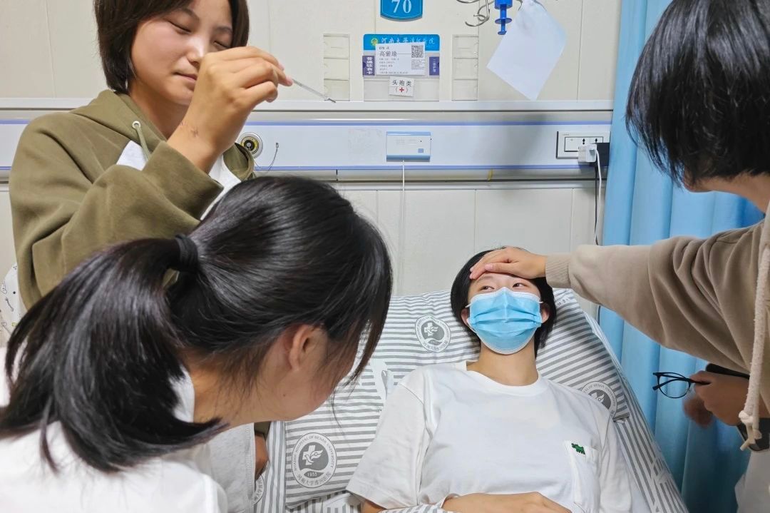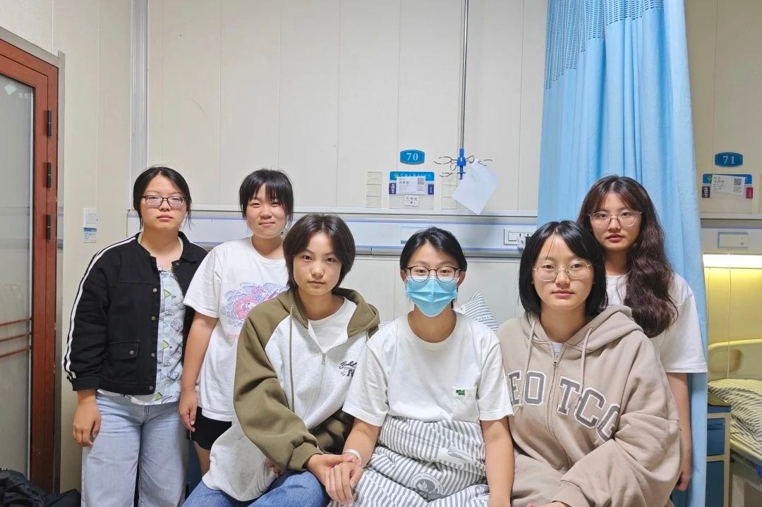 在这种情况下,高紫瑜同学所在506宿舍的五位同学,每天轮流守护在医院陪护,在最初的三天里,为了检测体温几乎是彻夜不眠,隔天还要继续完成军训的任务。庞晶晶同学在高紫瑜同学训练晕倒后第一时间联系了救护车,杨瑞同学在入院后帮忙办理了住院手续,杨瑞星同学和史妙雅同学陪同进行各项检查,王艺学同学每天送来换洗衣物……医院的流程复杂繁琐,对于同样初出茅庐的同学们来说,更是不亚于一场大型考试,但尽管如此,每个人都毫无怨言地照顾生病的同学直至康复出院。
