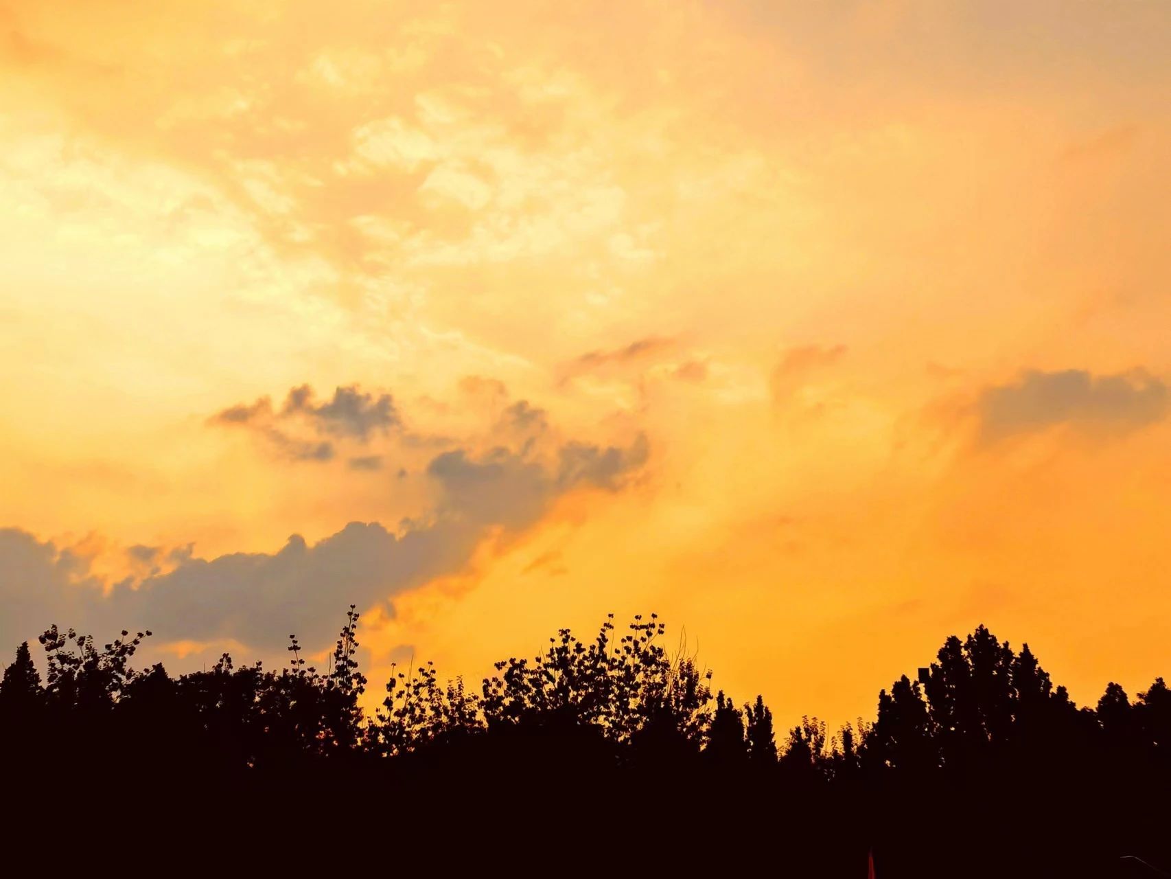 此时夕阳西下沉入地平线,收起了她刺眼的光芒,将西边的天空映照成一片金黄。落日的余晖不舍地在如丝如履的云朵上留下些许暗淡的红色,如同一幅金色的水墨画慢慢晕染了整片西南角。