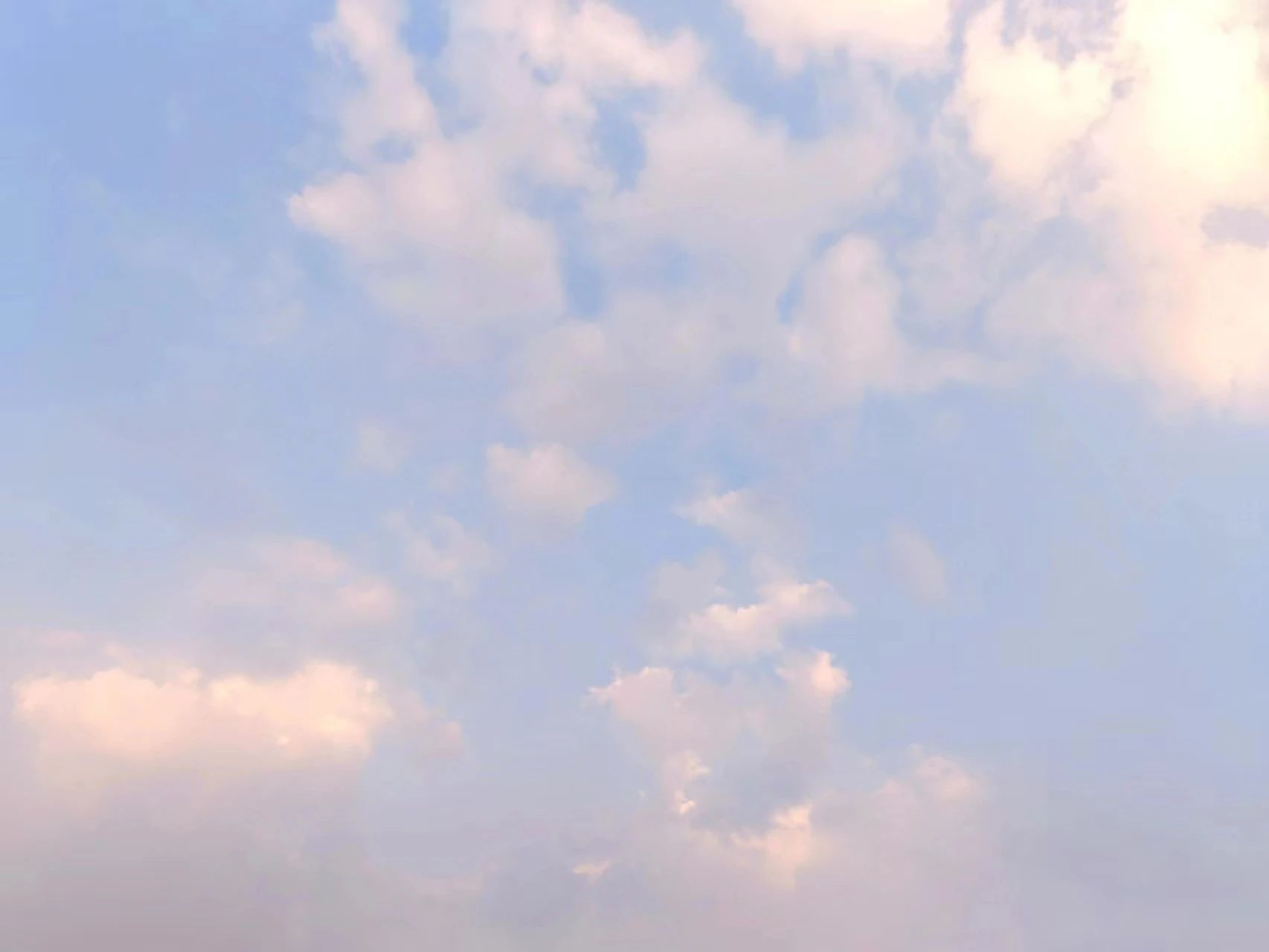 此刻夕阳还没完全落下,在一大朵一大朵的云彩上映照出浪漫温柔的粉色,如孩童粉嫩的脸颊,使人心情愉悦。太阳的光线在云朵上形成了亮部,使得云朵在空气中看起来柔和透明,更加轻盈,使人忍不住想拥入怀中。