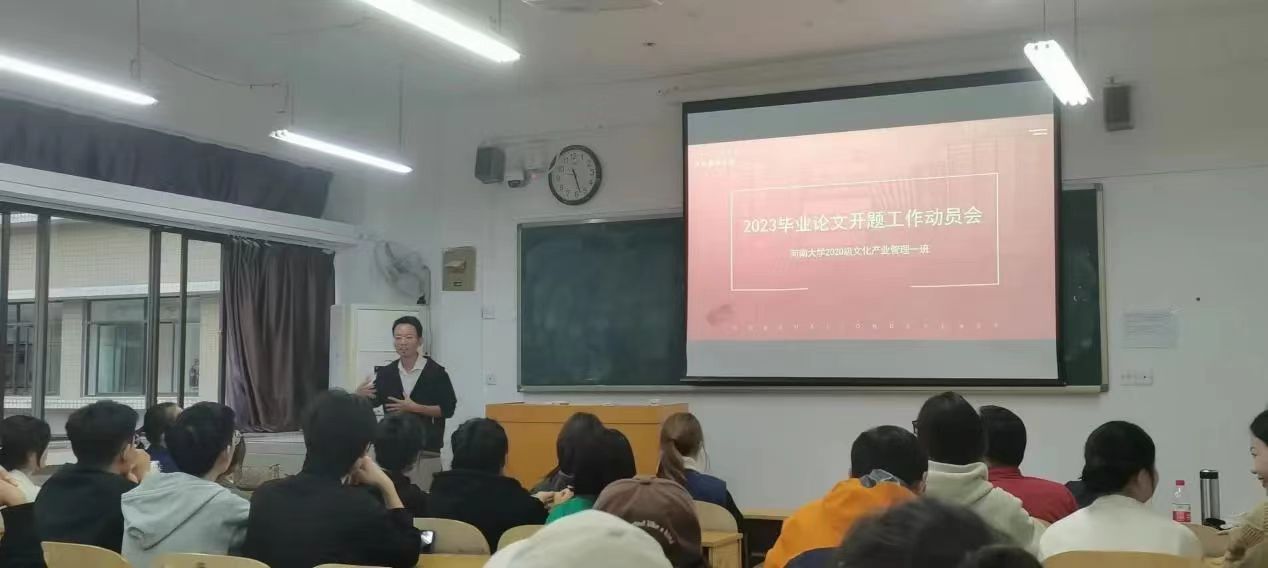 本次会议由文化产业管理系教师和学生参与,会议上系主任刘涛老师对本次动员会以及毕业论文的重要性进行强调,张召鹏老师、王淳老师、李涵闻老师、王四鹏老师、孙浬阳老师分别介绍自身研究方向,并给予同学们相应的毕业论文写作技巧和思路。