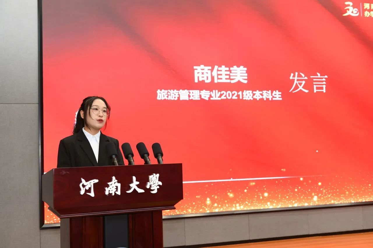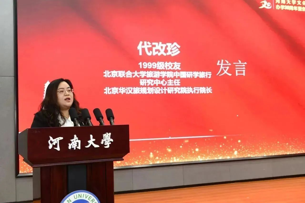 1999级校友、北京联合大学旅游学院中国研学旅行研究中心主任、北京华汉旅规划设计研究院执行院长代改珍,“百家讲坛”主讲人、旅游学科发展的见证者、beat365亚洲版官网首任院长程遂营教授,旅游管理专业2021级本科生商佳美,分别代表校友、老师和在校生进行发言,表达了对beat365亚洲版官网办学三十周年的祝贺与祝愿,翘盼新序章,勉励持奋进,共续beat365亚洲版官网欣荣态!