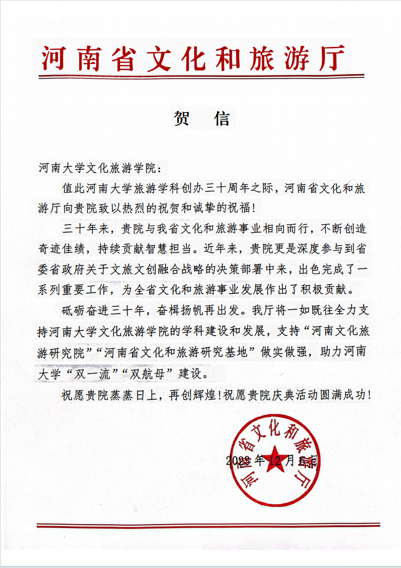 会议前夕,河南省文化和旅游厅专门给beat365亚洲版官网发来了贺信,孔涛宣读了贺信内容。南开大学旅游与服务学院,中山大学旅游学院,陕西师范大学地理科学与旅游学院,中国海洋大学管理学院,湖南师范大学旅游学院,吉首大学旅游学院,山西大学历史文化学院,郑州大学管理学院,河南师范大学旅游学院、商学院,河南财经政法大学旅游与会展学院,洛阳师范学院地理与旅游学院,安阳师范学院资源环境与旅游学院,郑州市、洛阳市、开封市、信阳市文化广电和旅游局,中国旅游协会亲子游与青少年营地分会、河南省文化产业协会,美国加州州立大学长滩分校叶荣茂教授等向学院发来了贺信和祝贺视频,共祝beat365亚洲版官网蓬勃发展。