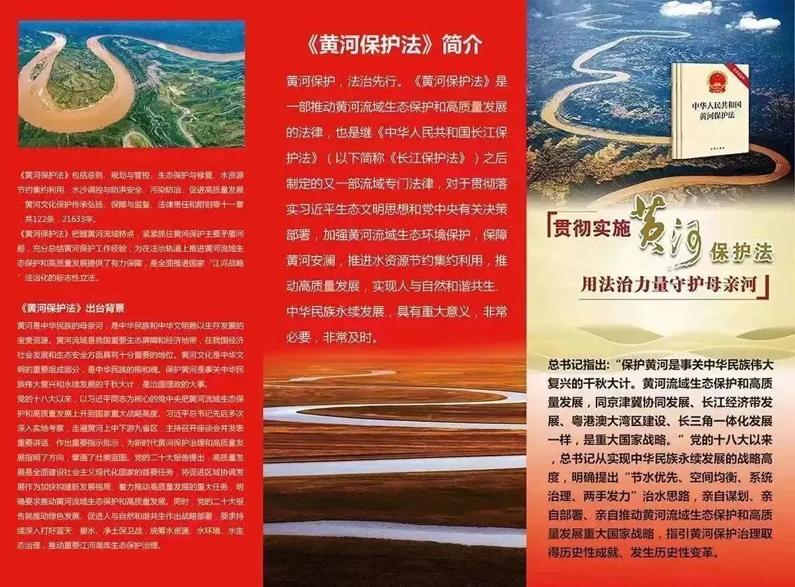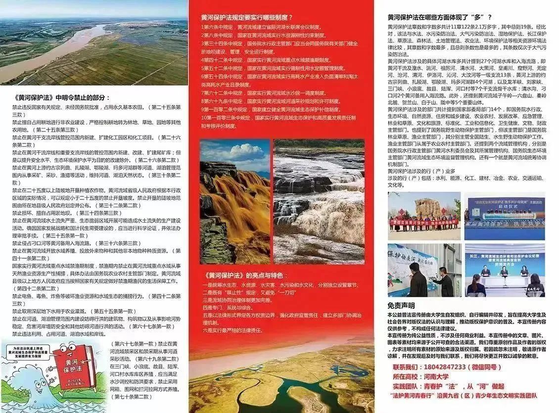 学习领会《黄河保护法》,夯实护河“主阵地”。实践开始前,队员们深入了解黄河保护法相关法律条款,提高宣传员对黄河保护法的认知与理解,深刻领会《黄河保护法》的立法精神,通过图文并茂的方式生动展示《黄河保护法》的重要内容,并制作了宣传海报、宣传手册、宣传视频与调查问卷。