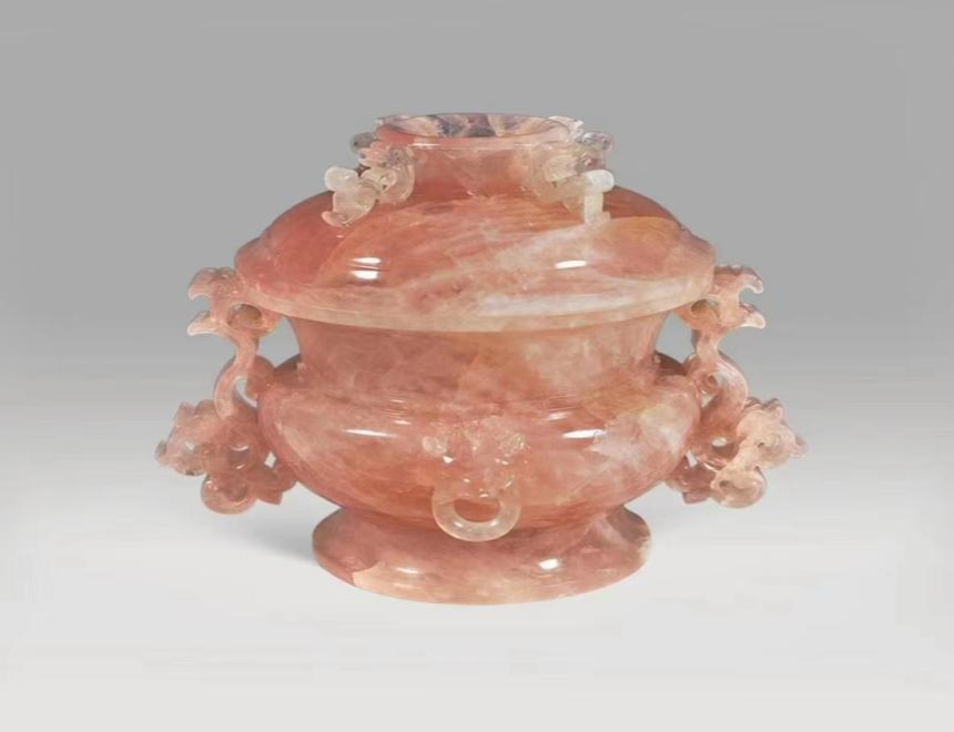 清乾隆芙蓉石蟠螭耳盖炉,是清朝时期的一件文物,现收藏于南京博物院。通高17厘米,口径14.9厘米此盖炉为粉红色,通体布满长短不一、大小相同的天然纹理,造型古拙敦厚,雕琢精细,腹部雕饰对称两组蟠螭和铺首衔环耳,盖顶也雕饰四条小蟠螭。