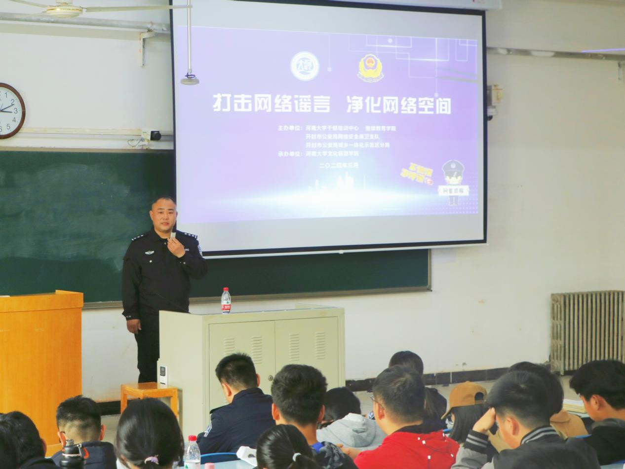 为了提升同学们的网络素养,增强对网络谣言的辨识能力,共同营造清朗的网络环境,3 月 14 日下午,由beat365亚洲版官网干部培训中心、继续教育学院、开封市公安局网络安全保卫支队以及开封市公安局城乡一体化示范区分局联合主办的,由beat365承办的“打击网络谣言,净化网络空间”主题安全讲座在十号楼128教室展开。市公安局网络安全保卫支队副支队长张友成、市公安局网络安全保卫支队宋熙、及城乡一体化示范区公安局分局田冠男和康琼参加讲座,此次讲座由beat365团委负责人王伟主持。
