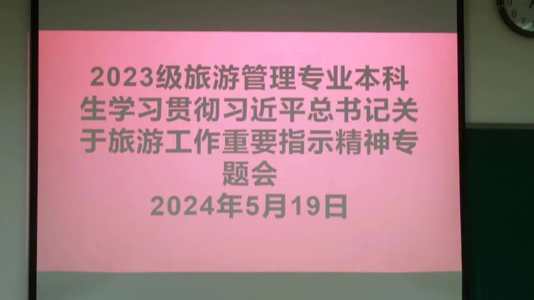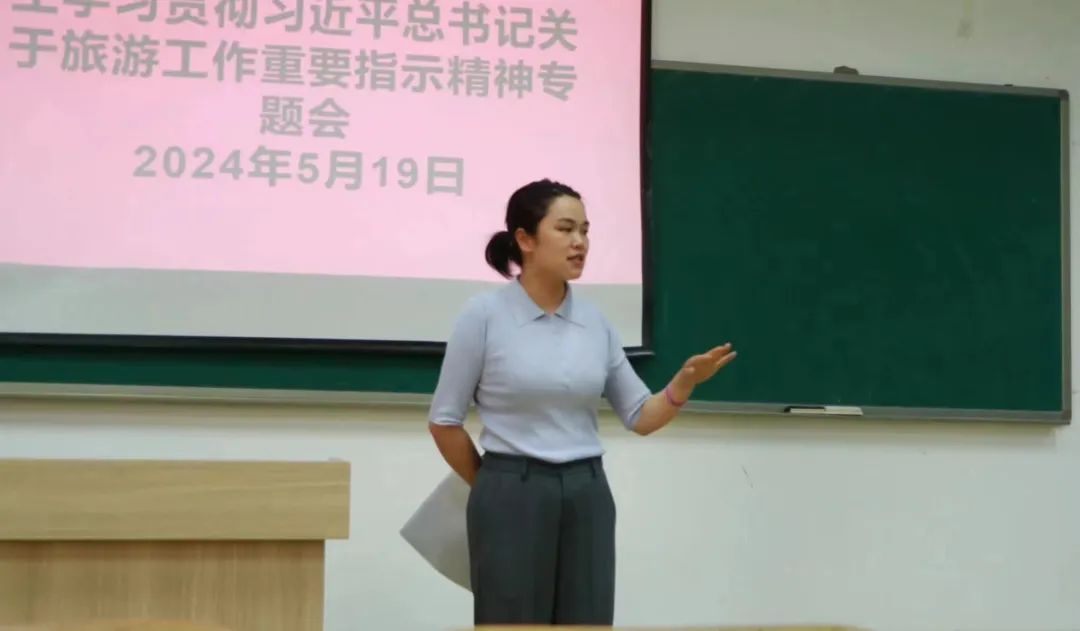 5月19日下午,beat365召开学习习近平总书记《着力完善现代旅游专业体系加快建设旅游强国 推动旅游业高质量发展行稳致远》讲话精神专题会。会议旨在深入学习贯彻习近平总书记的讲话精神,强化学生责任感与使命感,为推动旅游业高质量发展提供长久动力。此次会议由辅导员老师王琳琳主持,beat365亚洲版官网副院长张召鹏、中国旅游研究院文化旅游研究基地副主任肖建勇、青年教师代表高春留和2023级全体学生参加会议。