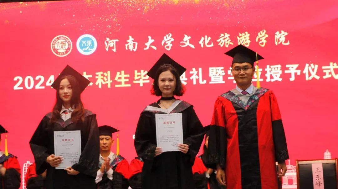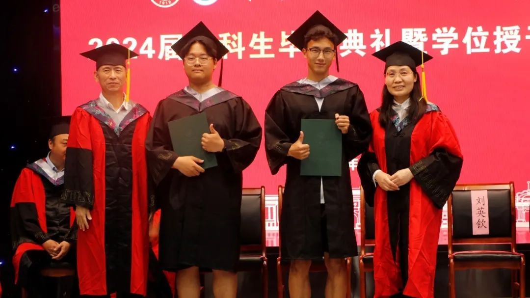 受校长张锁江院士委托,学院本科生学士学位评定委员会主任李竞艳院长和程遂营教授一起为学士学位获得者颁发学位证书,并庄重地为他们援正流苏。