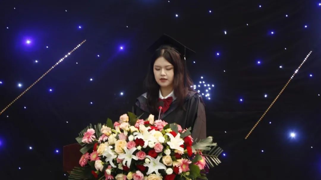 2020级旅游管理专业杜涵代表全体毕业生发言。她深情回忆了在校四年的点滴,分享收获与成长,代表全体毕业生向母校和恩师表达了由衷感谢和诚挚祝福。