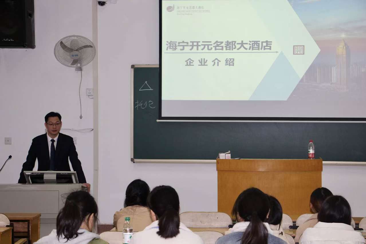 宣讲中,海宁开元名都大酒店房务部总监叶剑航向同学们介绍了酒店位置、酒店设施、酒店发展规模以及员工食宿等基本概况。接着,他结合个人经历,对该酒店的人才培养理念与培养方案进行了详细说明。同时,作为河大校友的他也表示期待与beat365进行更多更深入的合作,希望未来能有更多beat365优秀学子加入海宁开元名都大酒店。最后,与会人员与酒店负责人对实习事项以及个人职业发展等方面进行了相关交流,为毕业生提供了更多的就业渠道和信息。