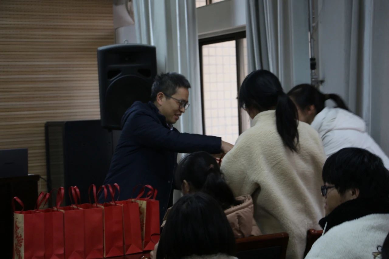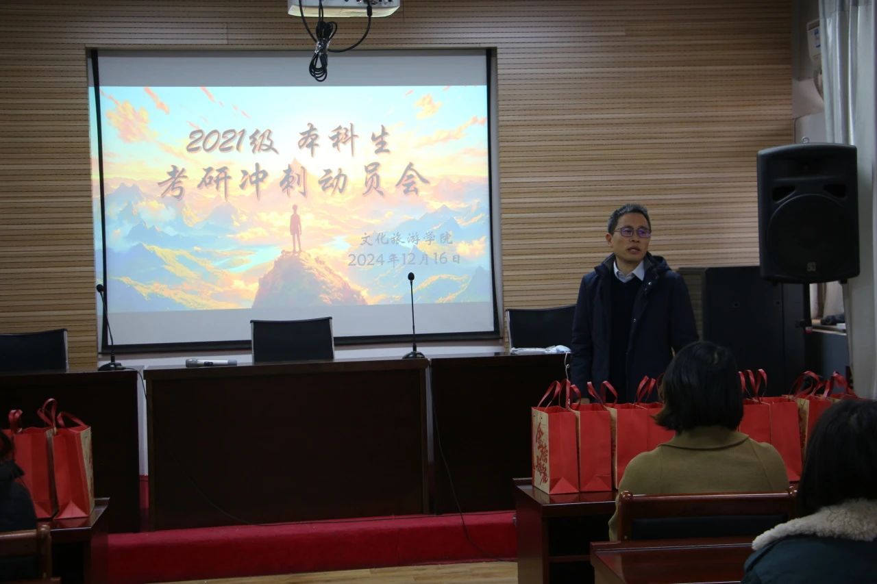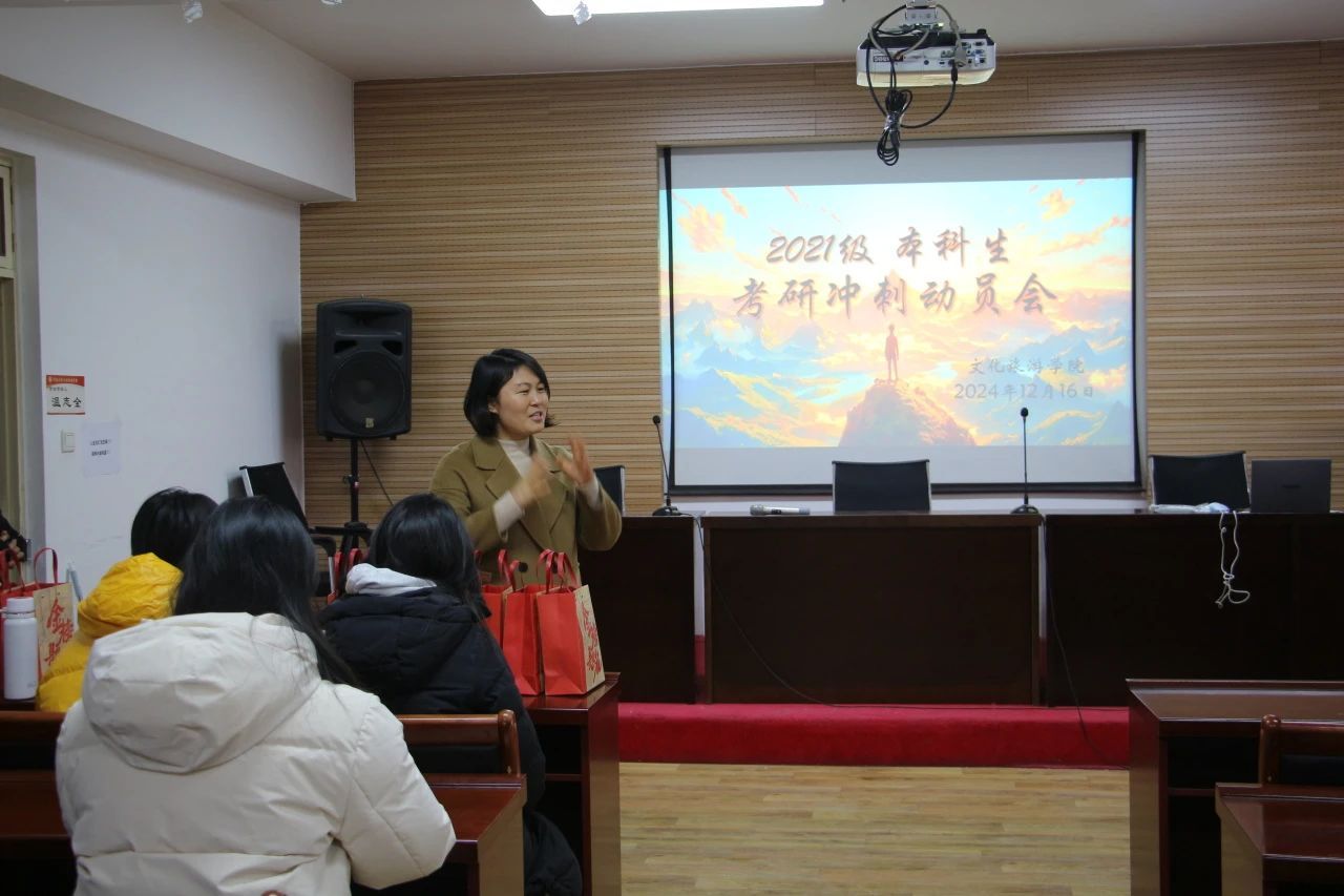 刘英钦在会上致辞,肯定了同学们备考路上的每份坚持与拼搏,到了最后的冲刺关头,大家更要沉心静气,夯实知识根基,查漏补缺,打磨知识体系的每一处细节。他还分享了考场上的宝贵实战经验,从巧妙分配答题时间,到精准拿捏书写要点,都是考场致胜的锦囊妙计。讲话结尾,那句“祝大家一战上岸”铿锵有力,如同冲锋号角。最后,他亲手将承载着满满祝福与殷切期望的考研礼包递至同学们手中。小小的礼包,传递了大大的力量。