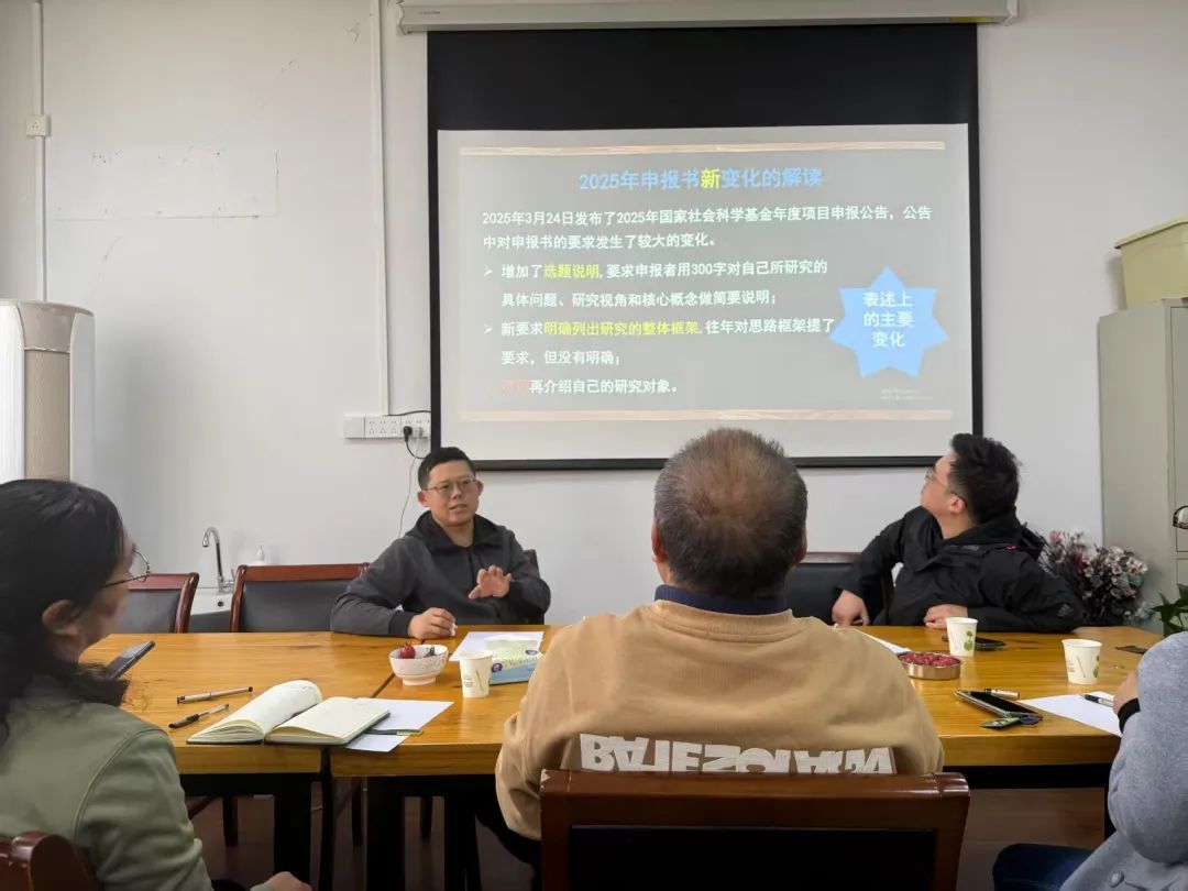 会议伊始,系主任陈楠教授对国家社科基金申报事项以及2025年申报书新变化进行了解读,强调要关注变化点及项目申报的导向意识,科研项目选题要注重“突出问题意识、学科视角” 。