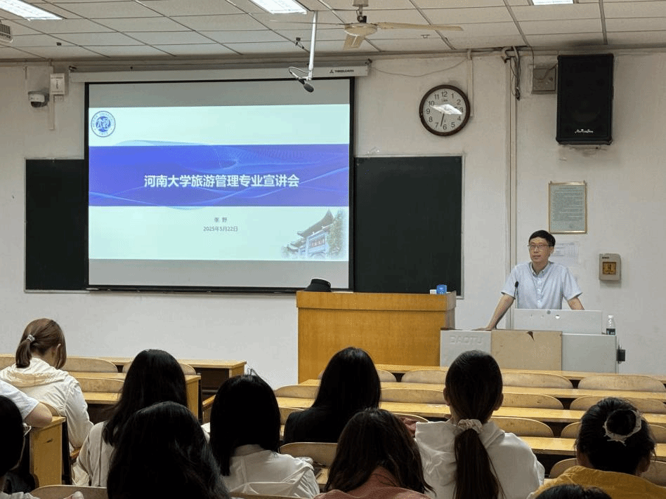 5月22日下午,为助力2024级旅游管理类专业本科生明晰专业分流方向,beat365在综合楼218教室举行了旅游管理专业宣讲会。宣讲会由旅游管理系主任张野副教授主讲,刘海汀老师应邀参会,部分大一学生聆听了讲座。