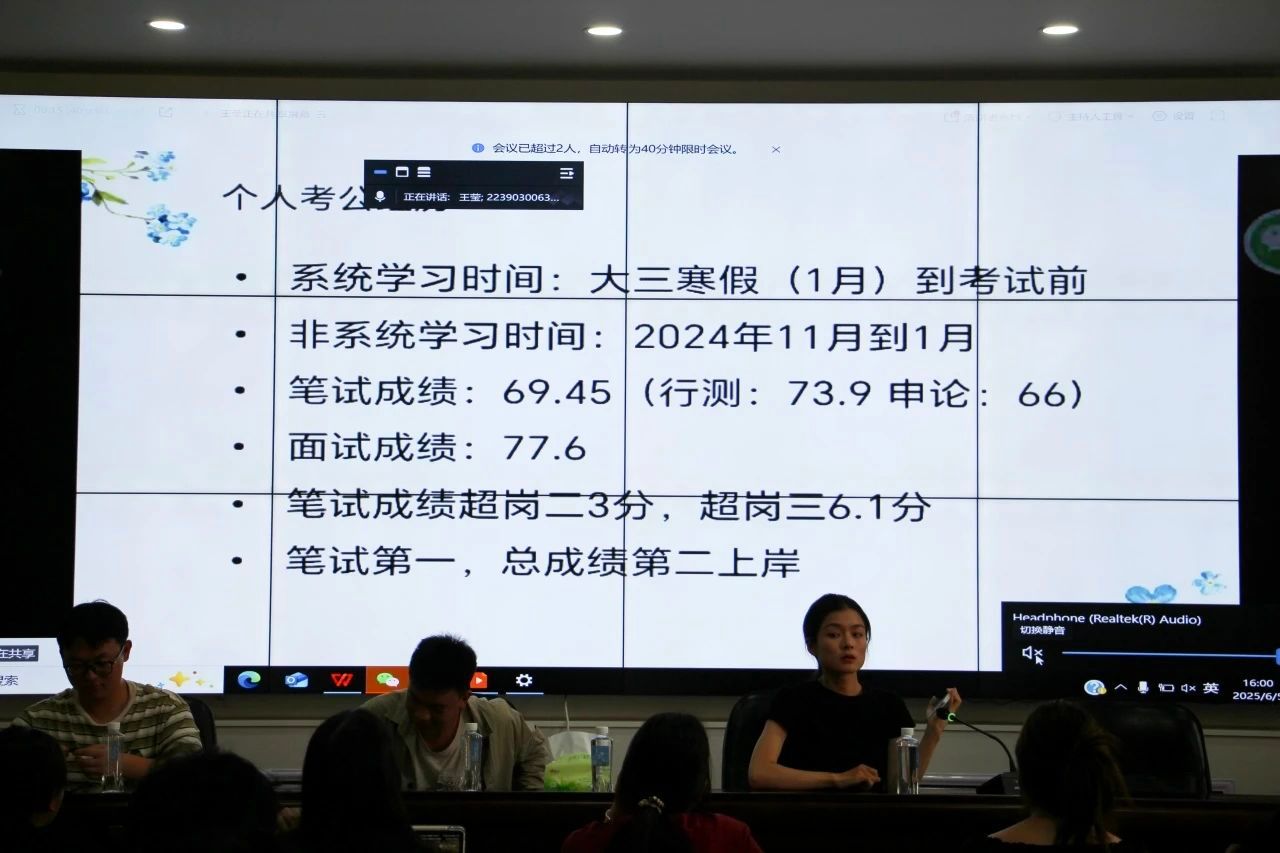 接着,王莹学姐通过线上方式带来了考公经验分享。她从报考利弊分析入手,分享了网上资料的选择方法和高效的学习方法,并结合自身经历,着重强调了报班学习和抓住笔试环节的重要性。王莹毫无保留的分享,为有考公意向的同学提供了清晰的备考思路。王艳岩再次总结,帮助同学们梳理重点内容。