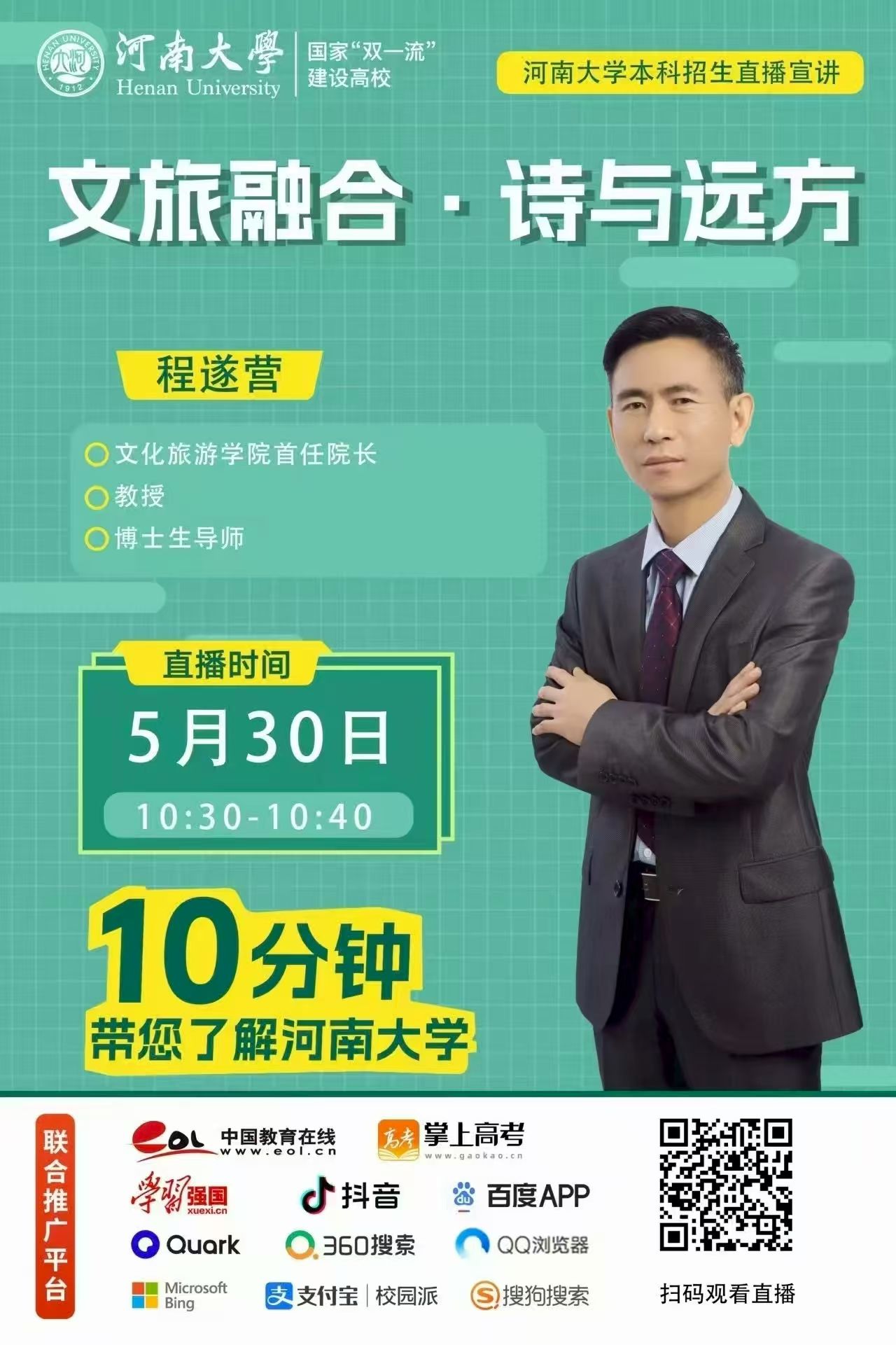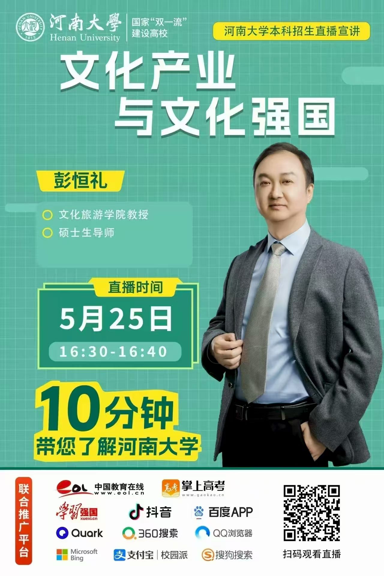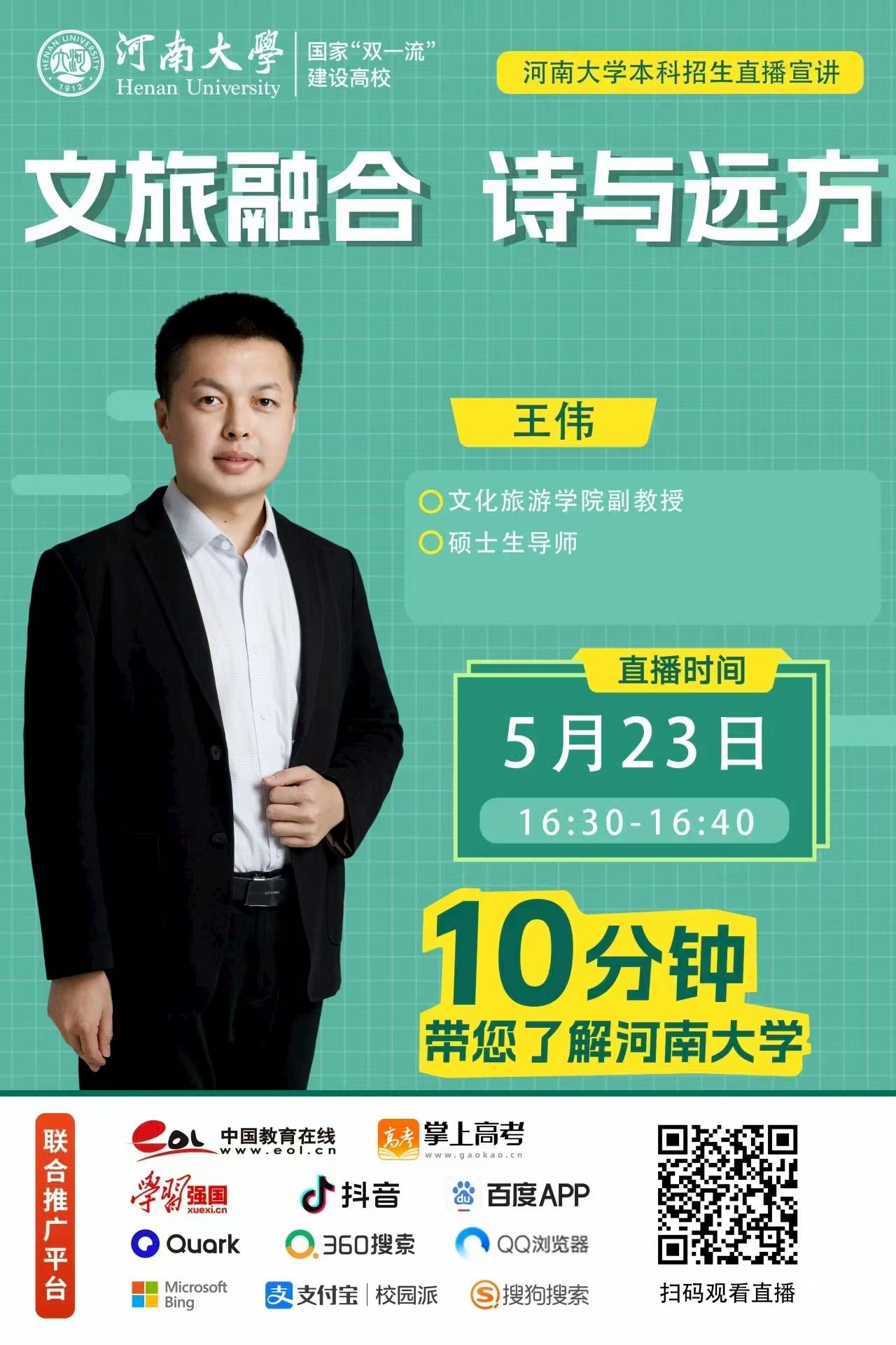 在学校招办的统一安排下,学院开展多场的线上直播宣讲会,知名教授化身“招生主播”,在线答疑解惑,实时与考生和家长互动;学院第一时间在官网主页上设置“招生宣传”专题板块,发布学院专业解读、专业排名、招生计划、历年参考等内容,在网站显要位置公布学院招生咨询电话和邮箱,为考生和家长及时提供全面权威的报考信息和咨询服务;充分利用学院微信公众号、视频号、抖音等媒体平台,推出《带着文化去旅行》学院招生宣传片、学长学姐专业说等系列招生宣传推文、短视频,邀请专业教师、优秀校友、在读学生分享专业学习、就业创业、校园生活方面的生动体验,以鲜活的视角展现学院的魅力。系列线上招生宣传活动的开展,累计吸引近万人次浏览观看,有效增强了招生宣传的覆盖面和影响力。