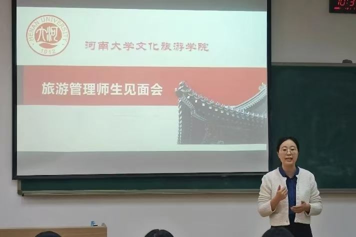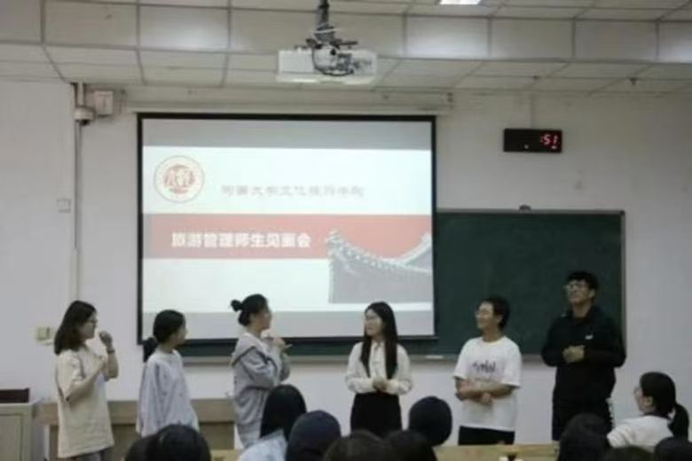 臧德清、王欢、常建霞、杜莹莹等老师用“接地气”的分享方式,拉近了师生之间的距离。从“海外游历”到“文化交流”,从“世界遗产保护”到“智慧文旅创新”,从“定制旅行策划”到“体验情感分析”,他们用生动的案例打破了新生对专业的模糊认知。臧德清老师不仅用多种语言交流,还为同学们表演了精彩的才艺。杜莹莹老师与学生一起进行“两真一假”游戏,并向新生讲解了数智文旅发展形势。最后,司艳宇老师总结到:文化是助力未来旅游发展的载体,是为旅游者提供审美与情绪价值的灵感来源。她强调旅游管理专业学习要回归本心,在学习中享受,在享受中学习。