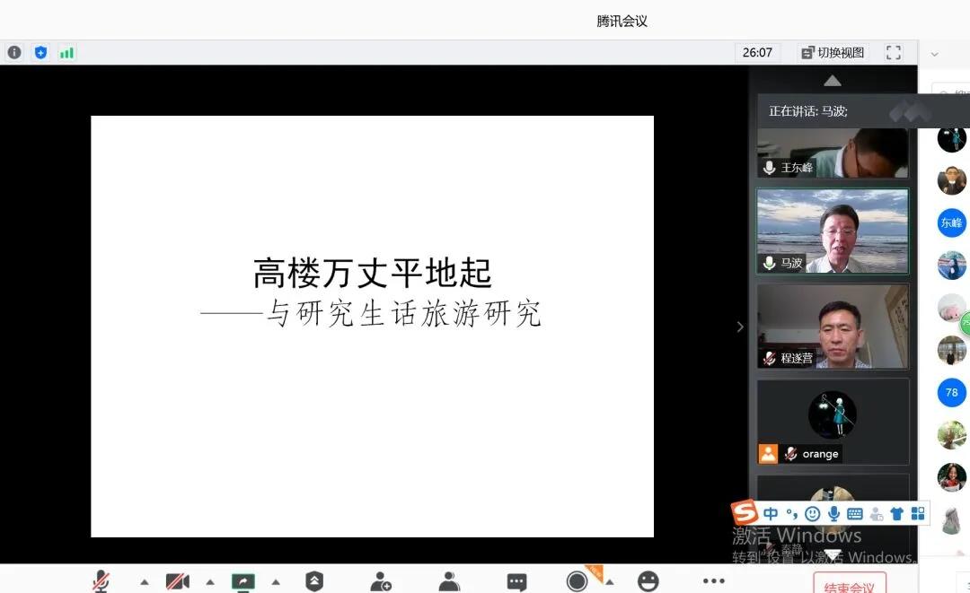 为进一步开阔研究生的学术视野,提高学院研究生学术研究能力,7月7日上午,青岛大学旅游与地理科学学院博士生导师马波教授以视频会议的方式,为beat365师生做了题为“高楼万丈平地起—与研究生话旅游研究”的学术报告。本次报告会由文化产业与旅游管理学院院长程遂营教授主持。