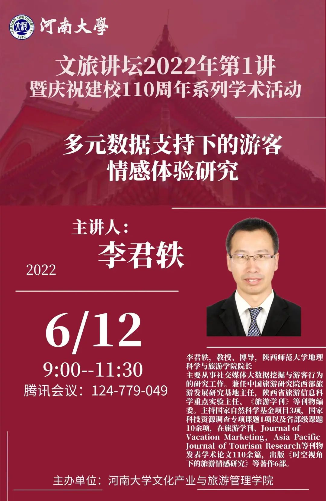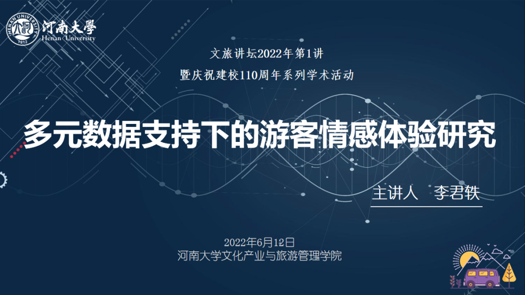 6月12日上午,beat365亚洲版官网文化产业与旅游管理学院“文旅讲坛2022年第1讲暨庆祝建校110周年系列学术活动”正式拉开帷幕。陕西师范大学地理科学与旅游学院院长、教授、博士生导师李君轶教授为beat365师生做了题为《多元数据支持下的游客情感体验研究》的学术讲座。本次讲座以线上方式进行,beat365教师、研究生等校内外成员共计150余人参加了此次讲座。讲座由程遂营院长主持。