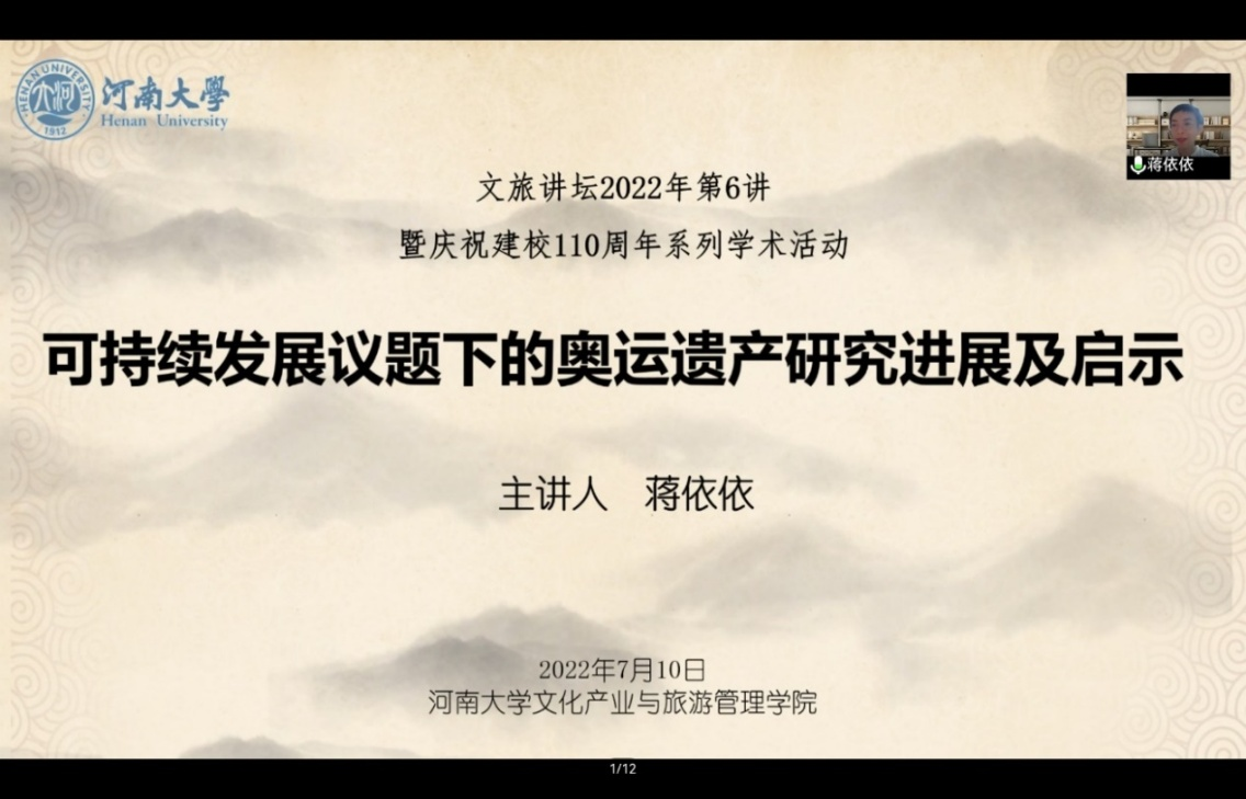 7月10日晚上,北京体育大学体育休闲与旅游学院副院长、博士生导师蒋依依教授以线上方式为beat365师生做了题为《可持续发展议题下的奥运遗产研究进展及启示》的学术讲座。讲座由文化产业与旅游管理学院院长程遂营教授主持。