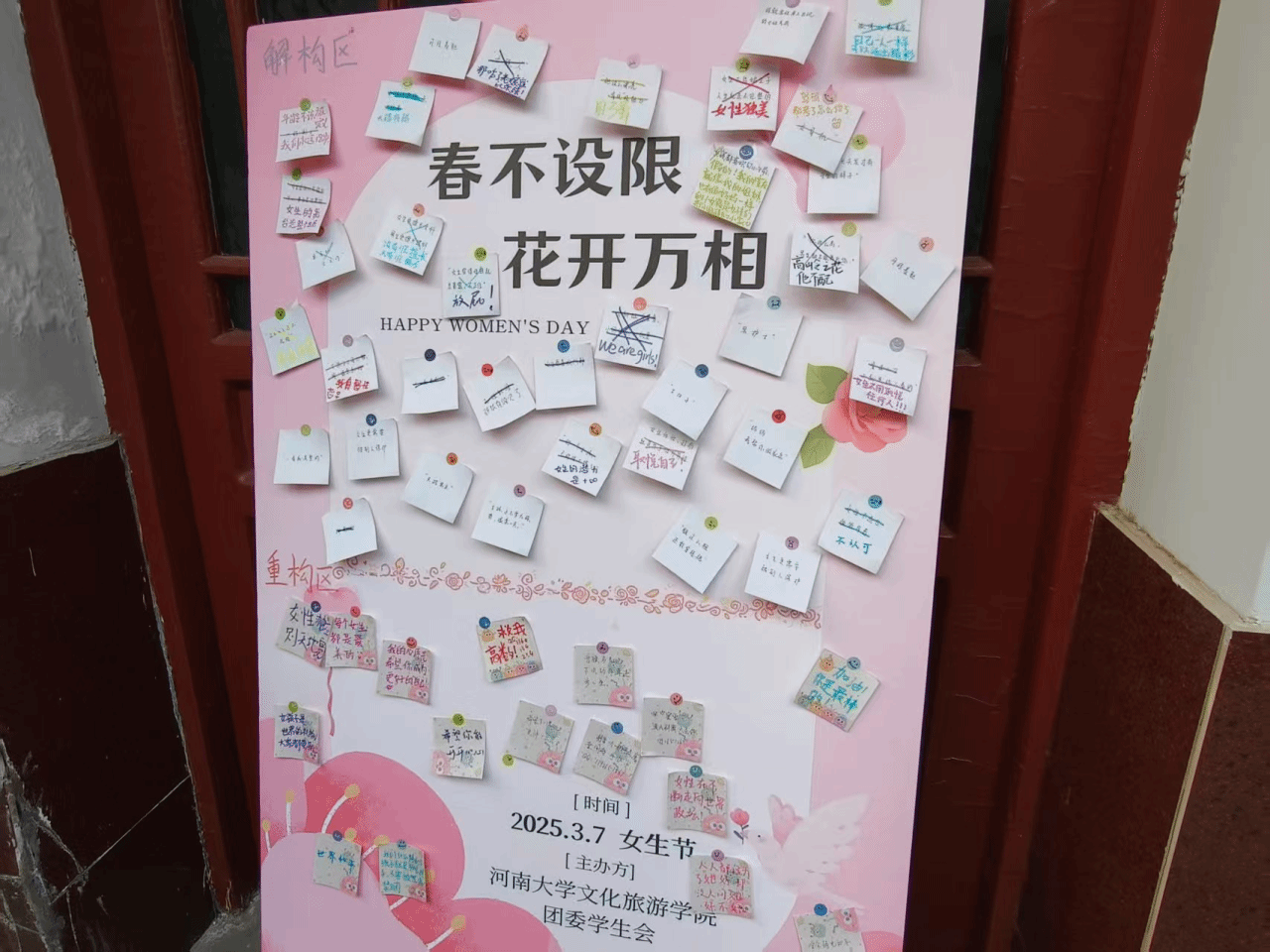 在五号楼门口,一块特别的画板吸引了众多同学的目光。画板被巧妙地分为 “解构区” 与 “重构区”。“解构区” 上,提前贴满了写有性别刻板印象的便签,这些标签曾像无形的枷锁,束缚着女生们的发展。参与活动的女生们勇敢地走上前,仔细挑选出自己最想打破的那条偏见,然后果断撕下,并在便签上肆意涂鸦覆盖。