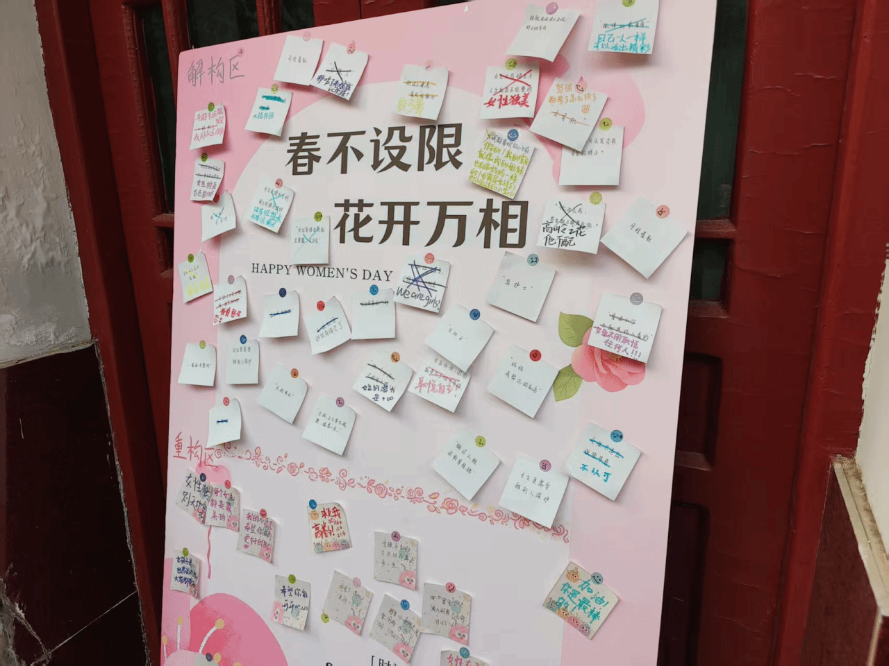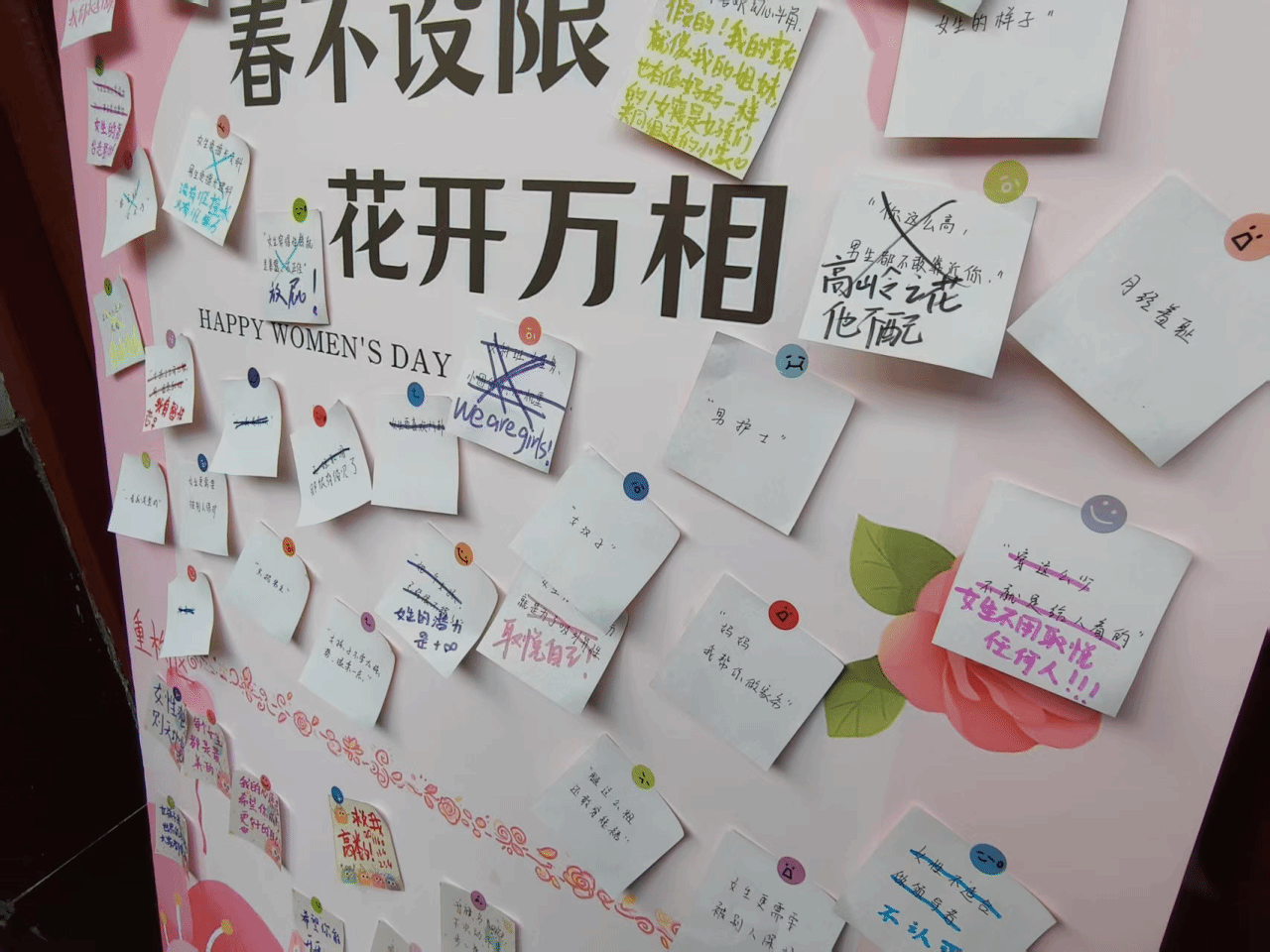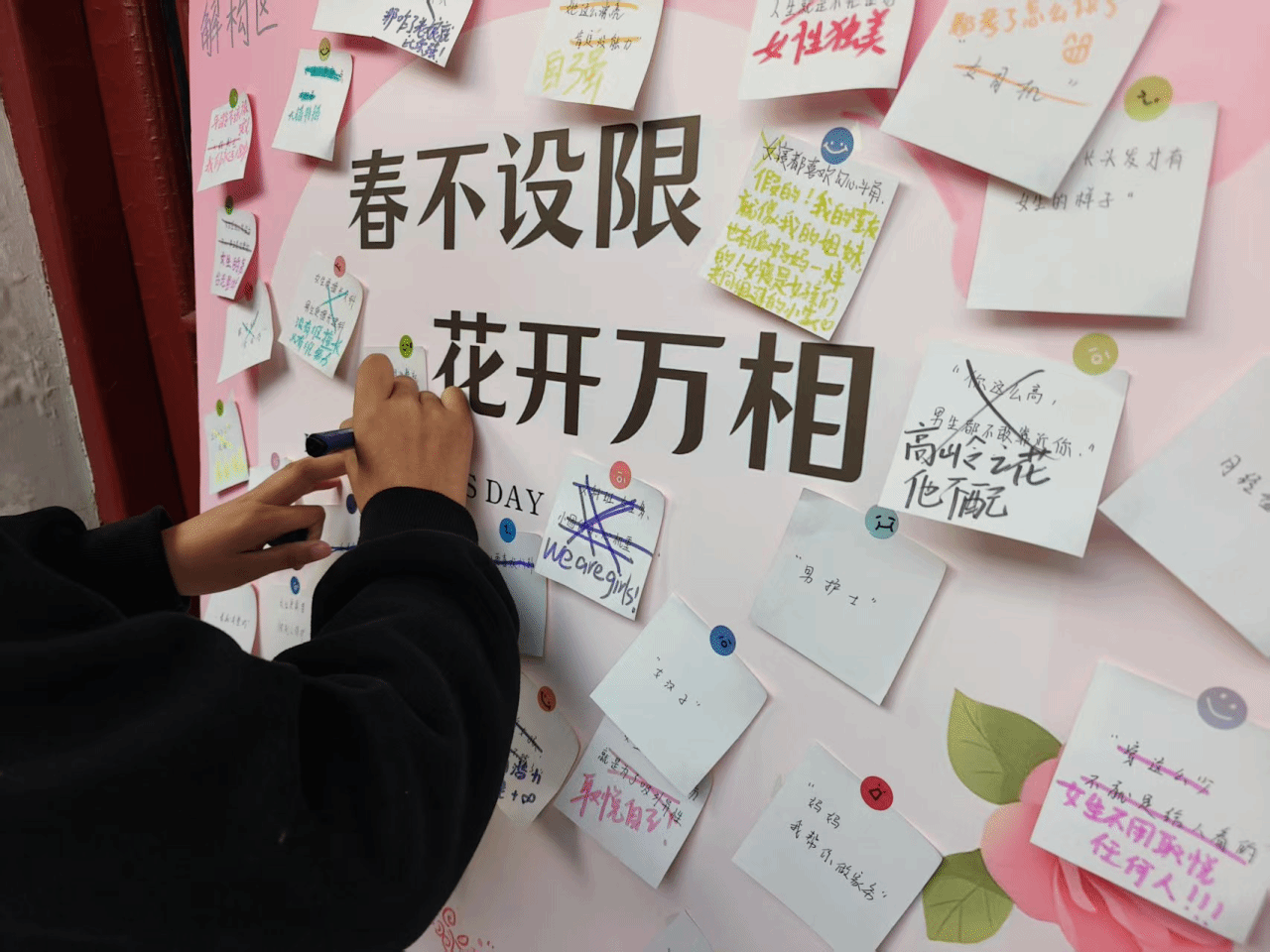 当刻板印象被涂鸦层层掩盖,女生们仿佛也挣脱了束缚。她们将便签翻到背面,认真写下自己的心愿。有的女生希望能在学业上取得突破,有的期待能交到志同道合的朋友,还有的写下了对未来美好生活的向往。