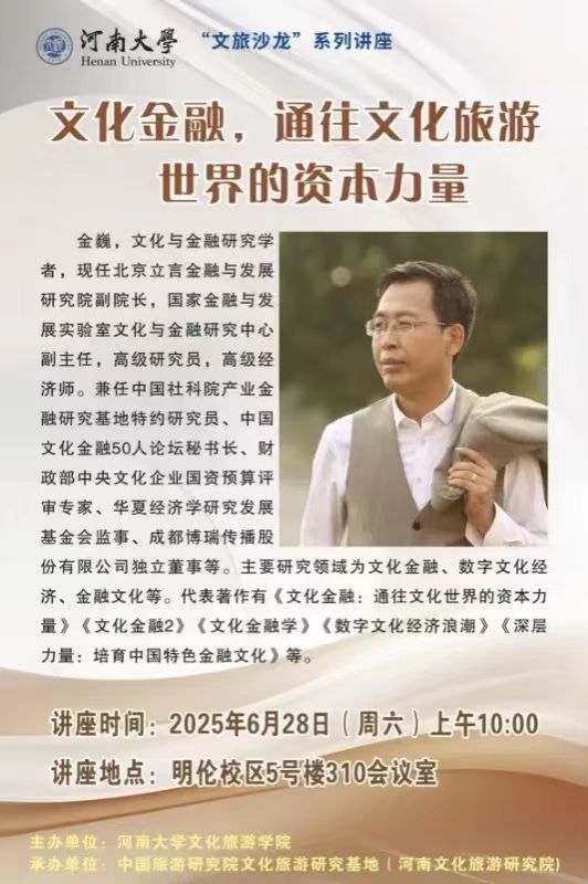 6月28日(周六)上午10:00, “文旅沙龙”系列讲座将在beat365亚洲版官网明伦校区5号楼310会议室举行。本期讲座的主题是“文化金融,通往文化旅游世界的资本力量”,主讲人为北京立言金融与发展研究院副院长,国家金融与发展实验室文化与金融研究中心副主任金巍。