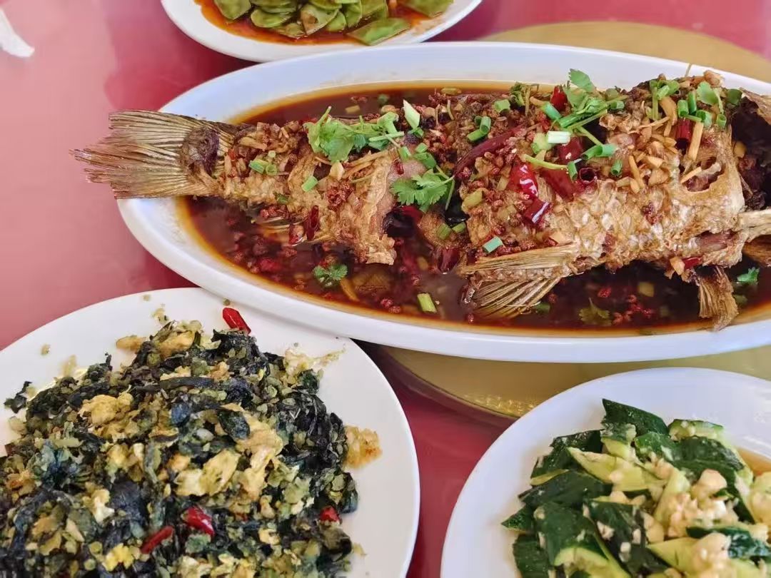 我们选的是“河畔人家”,店门口的大水池里,养着不少当地的黄河鱼,我们挑了条活蹦乱跳的,看着就新鲜。接着进了店,对着琳琅满目的新鲜食材现点现做——咱就爱吃这口现摘现做的鲜,预制菜可入不了眼。