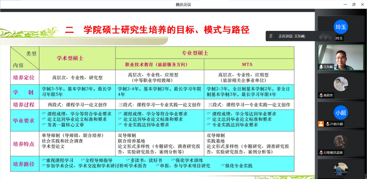 在报告中,王东峰副院长从学院学科发展历程出发,在对学院学科发展地位、研究生导师队伍建设、科研平台建设、科研成果与特色研究方向、历年研究生毕业去向等进行详细介绍的基础上,紧紧围绕学院研究生培养的目标定位、培养过程、培养特点、学制设置、毕业要求等内容,重点对学院三类研究生的培养目标、培养模式与实施路径进行了深入详细的解读。
