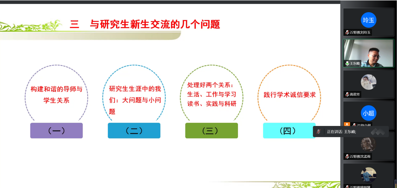 对于如何才能更有意义地度过研究生阶段的学习生活,王东峰副院长立足于研究生的使命、责任和追求,围绕“构建和谐的导师与学生关系”、“研究生生涯中的我们:大问题与小问题”、“处理好两个关系:生活、工作与学习;读书、实践与科研”、“践行学术诚信要求”四个问题与2022级研究生新生进行了深入的交流和探讨。强调研究生阶段的学习要注重“道”与“术”的统一,要把读书和科研、深度和厚度、融合和创新有机结合起来,既要有质疑精神,又要敢于探索真理;既要有艺术的诗情画意,还要有科学的理性严谨;既要做到仰望星空,还要做到脚踏实地。