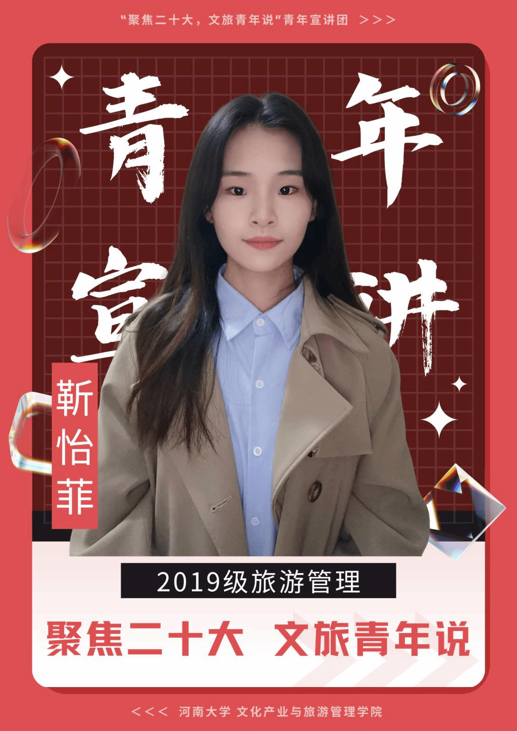 为深入贯彻学习党的二十大精神,深刻体会习近平总书记关于青年工作的重要思想,引导学院团员青年在学思践悟中坚定理想信念,在奋发有为中践行初心使命,充分发挥优秀青年榜样引领作用,beat365推出“聚焦二十大 文旅青年说”系列宣讲活动。