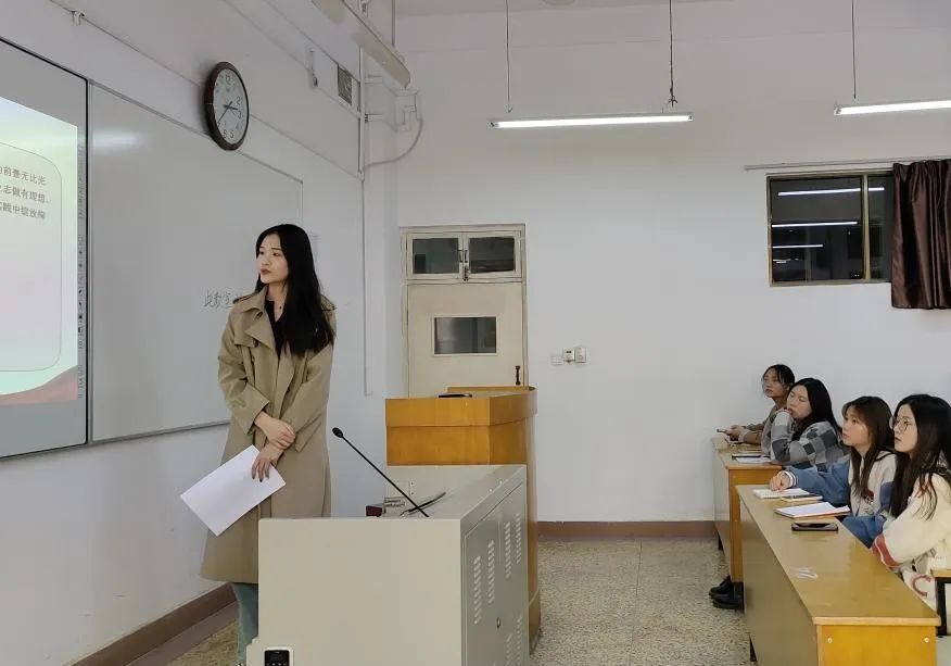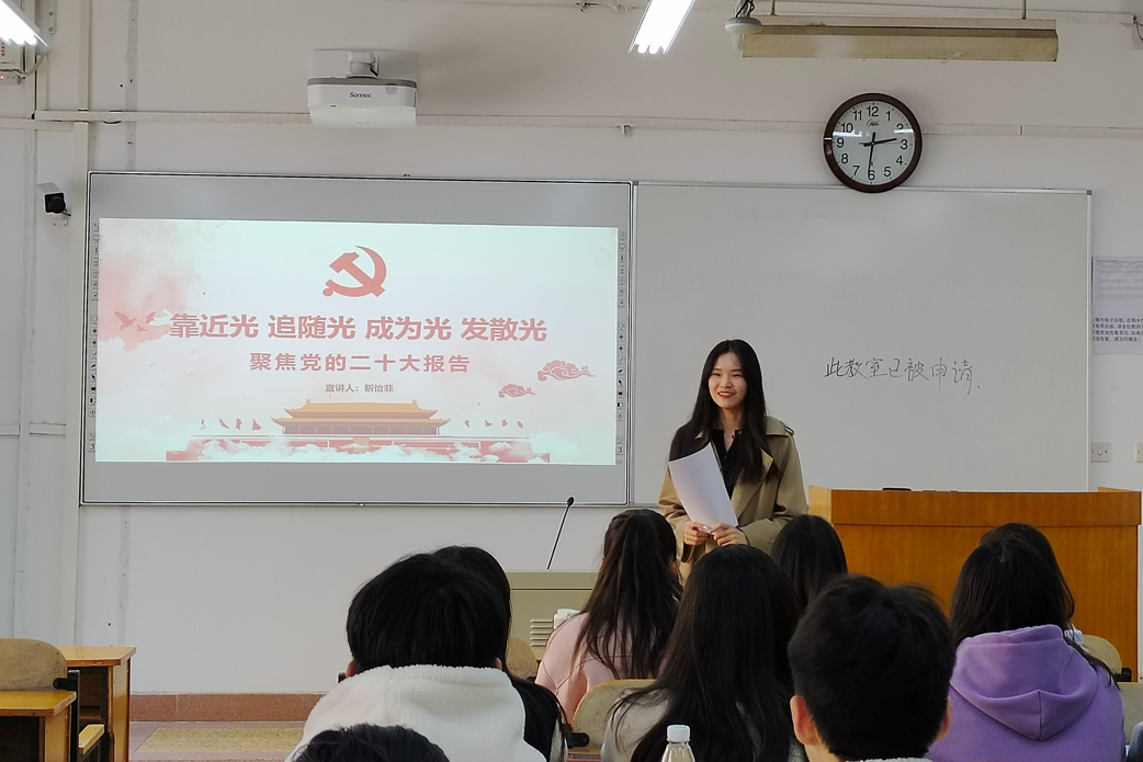 3月2日下午,靳怡菲面向旅游管理类2201团支部与旅游管理2102团支部做了主题为“靠近光 追随光 成为光 发散光——争做一名优秀的新时代大学生党员”的宣讲。